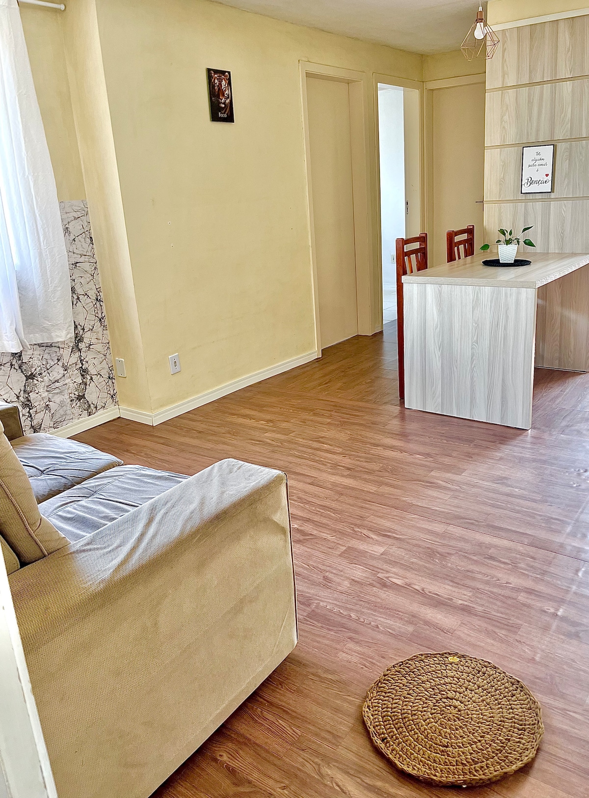 Apartamento moderno, cómodo y funcional. Departamento en un piso alto, con vistas panorámicas y una excelente ubicación, junto a la Av. Dom Joaquim, entre el centro y la zona norte. Totalmente equipado: aire acondicionado en el living y la suite, chimenea ecológica, televisores de 55” y 43”, cocina con lavarropas y secarropas, parrilla interior, sartenes eléctricas y espacio de trabajo con impresora. Departamento con cochera, pileta con tobogán, cancha deportiva y salones para fiestas/gourmet (sujeto a disponibilidad).