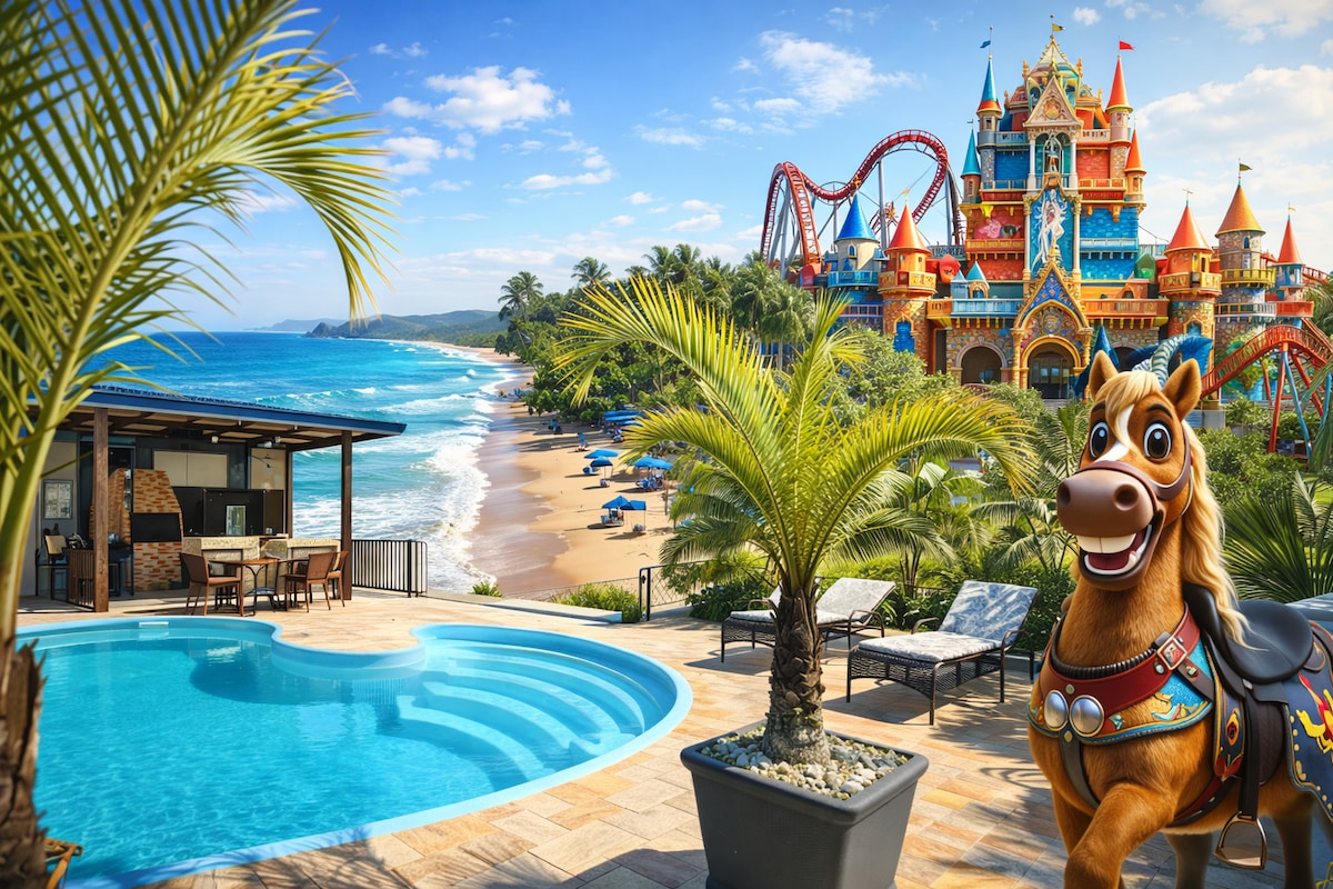 casa con 6 suites todas las suites con ropa de cama mantas toallas de baño y cara con bañera de hidromasaje aire acondicionado minibar tv con wifi en todas las habitaciones sala con tv integrada a la cocina con nevera microondas filtro de agua sandwichera cafetera licuadora air fryer lavandería con lavadora lavabo piscina parrilla de carbón garaje para 4 coches con panadería mercados restaurantes pizzería el Beto Carrero a 3 minutos y la playa cerca de la casa