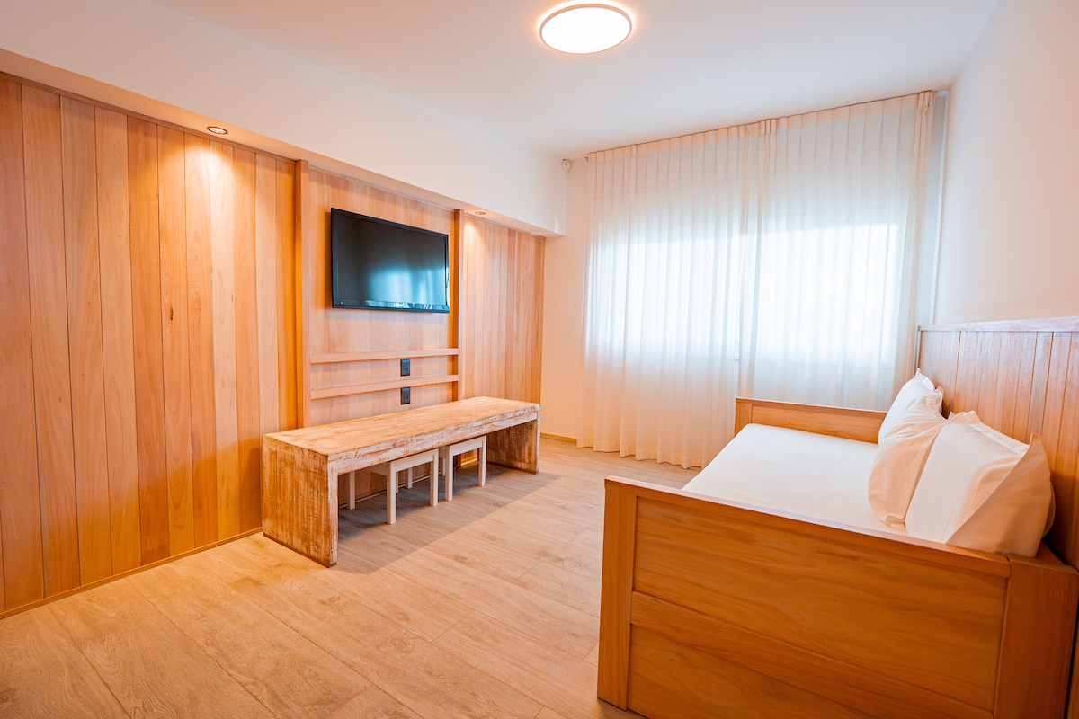 Opción ideal para familias, grupos o para quien busca una habitación más amplia y cómoda. La habitación posee cama doble tamaño queen y una individual o tres camas individuales según su preferencia. Posee además terraza con juego de mesa, sillas y sombrilla. Disfrute todo el año de una bebida o un libro en su terraza privada con el refrescante aire del Atlántico. Disponible en planta baja o primer piso por escaleras.