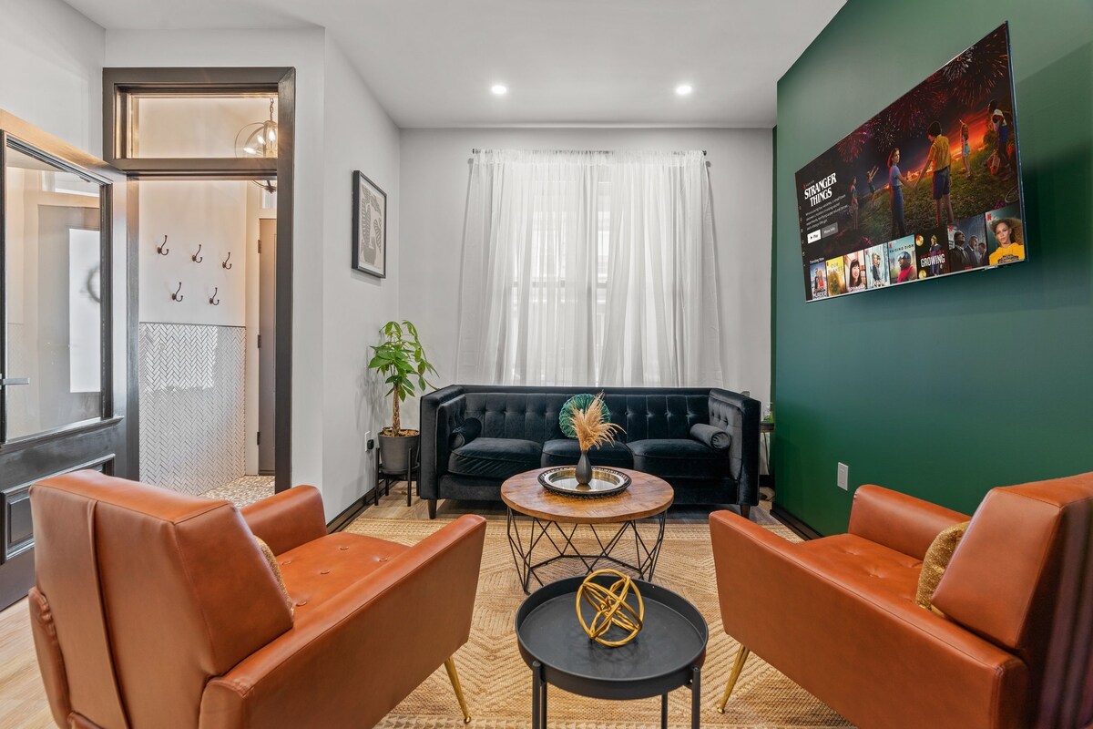 The Modern Gem Luxury Escape, where each detail ensures comfort, style, and entertainment. With a TV wall boasting four 65-inch screens, LED-lit beds, a cozy backyard with string lights and fire pit, every moment promises luxury and relaxation. Nestled just outside Center City, our location offers convenience and charm. You're within walking distance of the Philadelphia Art Museum, home to the iconic Rocky statue, allowing you to immerse yourself in the city's vibrant culture and history.
