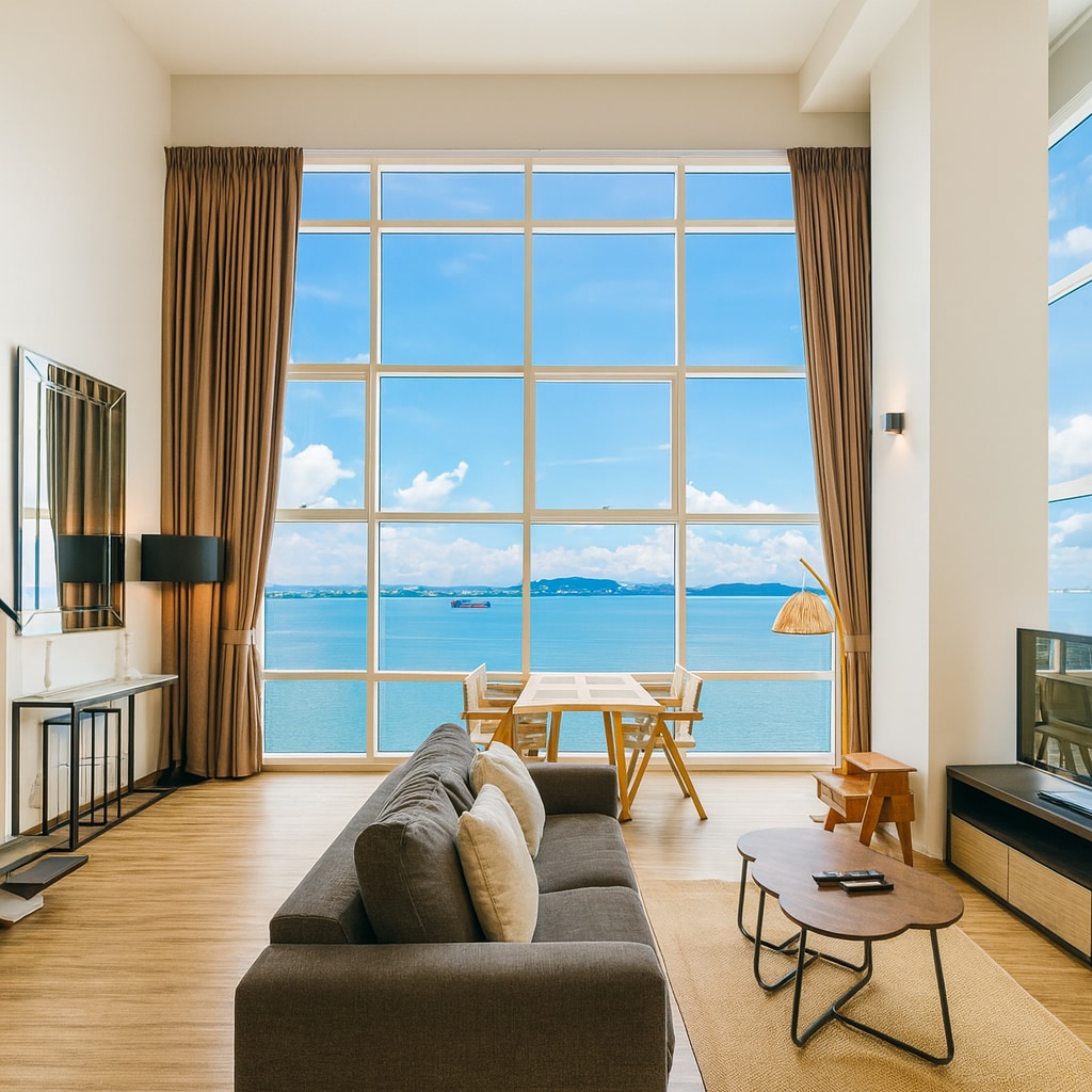 Departamento dúplex de 93 metros cuadrados con 2 dormitorios y vista al mar con vistas al amanecer en Georgetown-Maritime Suites ★ Ubicación privilegiada: a 10 minutos en auto del área histórica de George Town ★ Secador de pelo de alta gama ★ 2 estacionamientos interiores gratuitos con seguridad las 24 horas Wifi ★ de alta velocidad ★ Cargador de vehículos eléctricos disponible (se aplican tarifas) ★ Acceso gratuito a la piscina y al gimnasio. ★ Alimentos y bebidas, supermercados y lavandería a poca distancia, además de un paseo marítimo para correr y relajarse ★ Ideal para viajes médicos: a 10 minutos en auto del Hospital Loh Guan Lye, Gleneagles y el Hospital Island