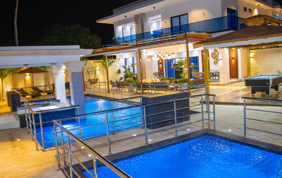 propriéda dentro de un jardin tropical frente a la playa ,con 8 habitaciones con baño privado aire condicionado abanico 2 piscinas agua dulce y sala en una zona résidencial espacio con BBQ y horno cocina equipada y cocina al bar con neveras freezers ,désayuno incluido ,planta y inversores ,parquéo privado vigilado con camera playa salvaje acceso directo wifi con CLARO y ALTICE télévisions en sala SKY y CLARO