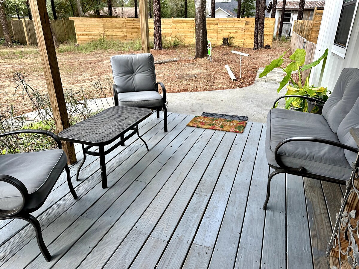 Come make memories you won’t forget in our beautiful, romantic tiny house. Watch the sunrise over the fields while sipping a cup of coffee. You will Enjoy exploring the nearby Coldwater Creek during the day, Or if you rather relax on the most beautiful beaches in Florida, it is a short drive. After a busy day, enjoy a magnificent view of the sunset or watch the deer as they approach the fields from the East. Please understand we are still improving the outdoors with additional landscaping.