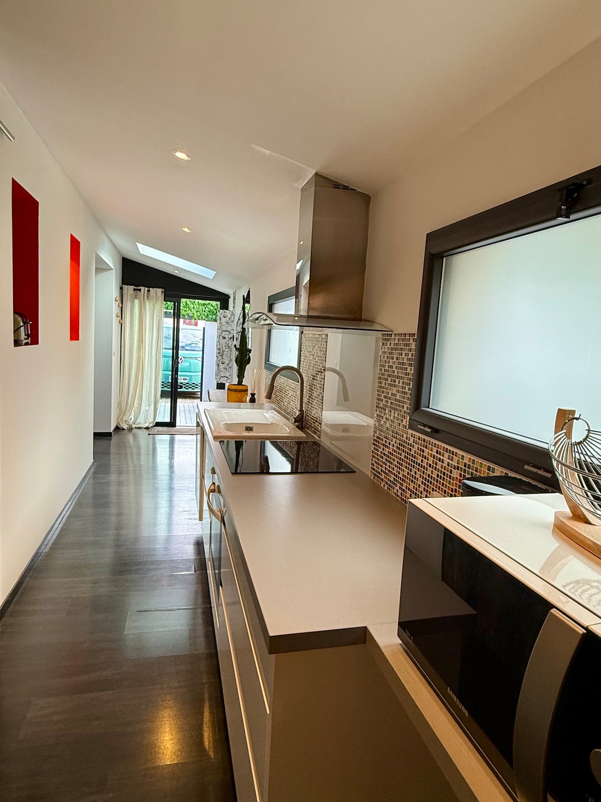 Dúplex con entrada independiente de la casa principal. Cuarto de baño: secador de toallas que sopla, secador de pelo. Ventana con terraza privada que da al jardín común de la casa. Cama de 2 plazas arriba + 1 colchón de 1 plaza en el suelo (bajo petición) Pequeña nevera, hervidor de agua, microondas, tostadora, cafetera Senseo, vajilla. Ventanal y velux con persianas opacas eléctricas. Productos alimenticios, de aseo y de limpieza básicos para empezar. Se proporcionan sábanas y toallas.