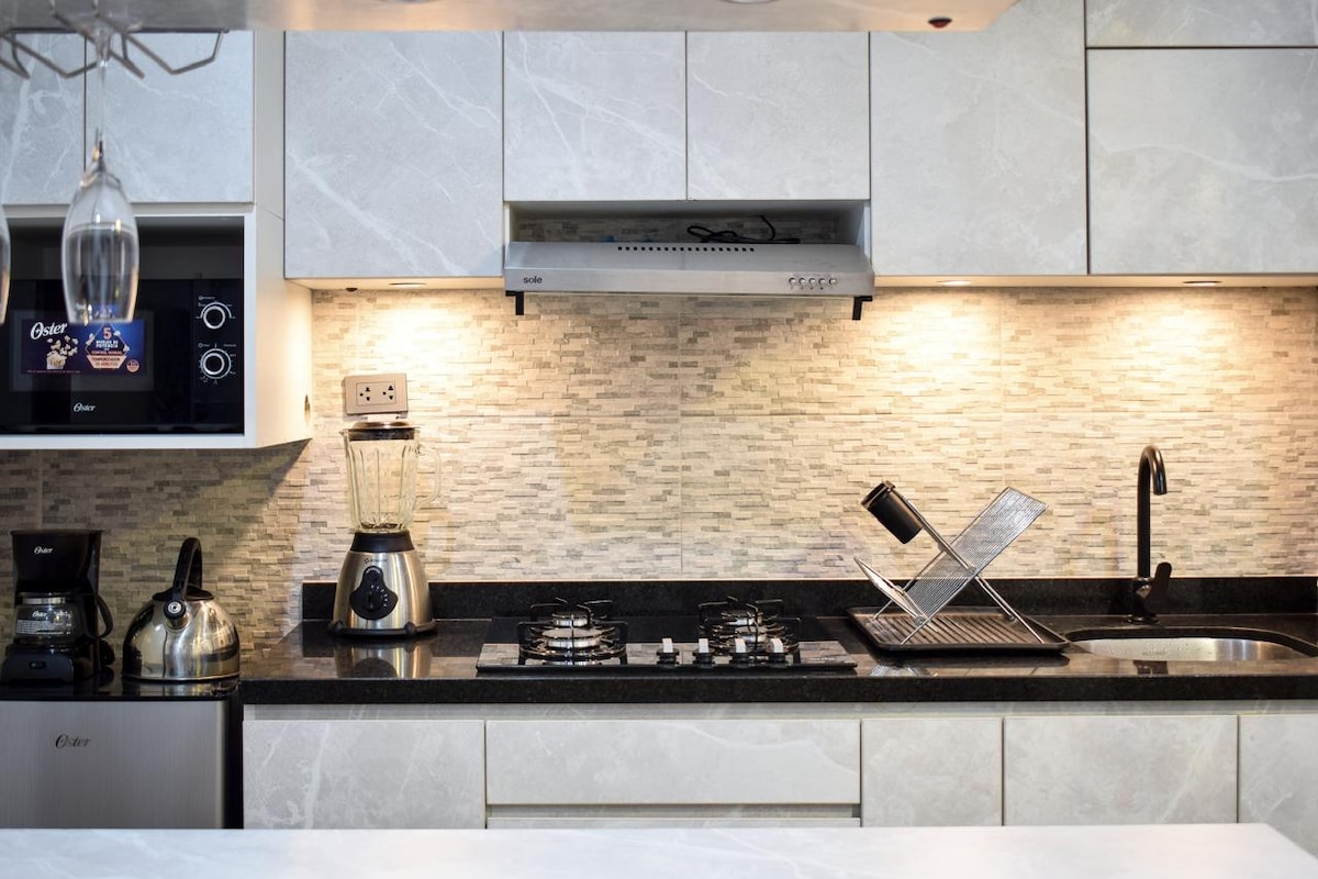 Habitación con cama king, baño y cocina americana a 350 m de la plaza principal