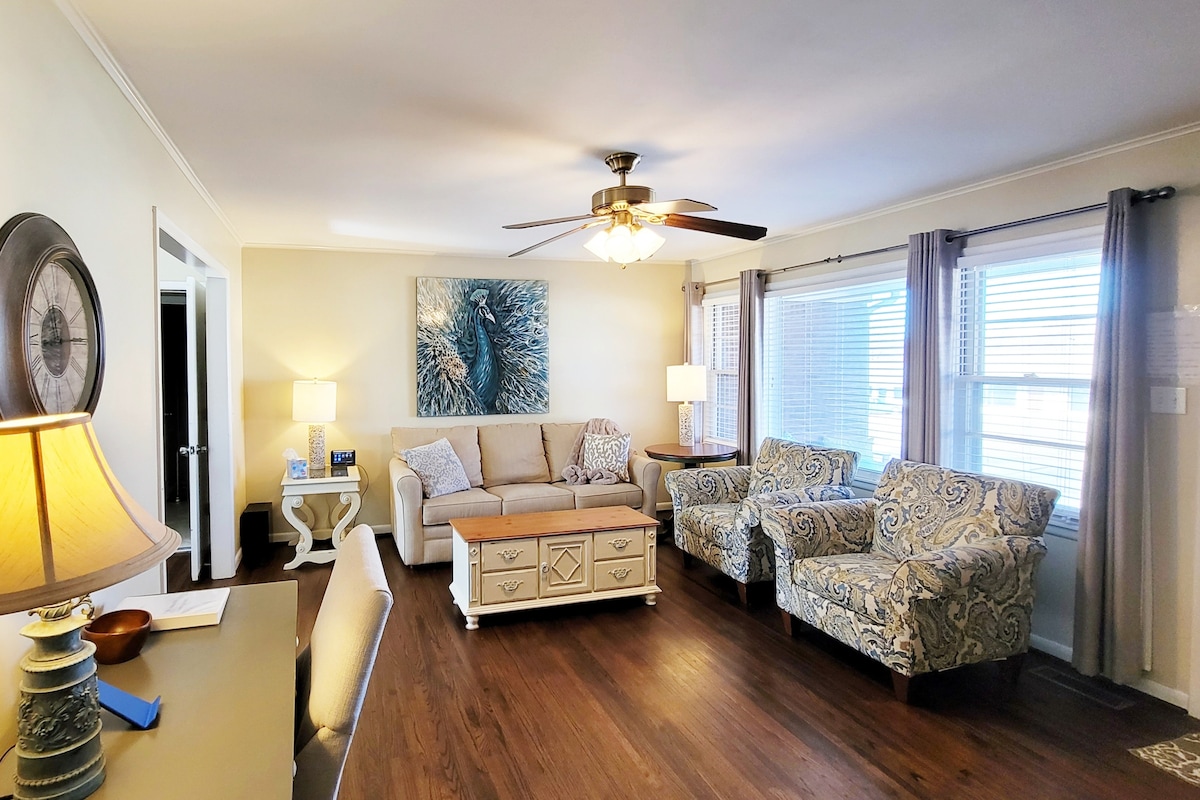 Construida en 2018, nuestra casa de campo tiene estacionamiento privado fuera de la calle y entrada con teclado. La planta abierta es soleada y espaciosa. La zona de estar de la planta baja tiene un televisor de 55 pulgadas. El baño de arriba tiene una bañera profunda. El dormitorio king de arriba se abre al balcón. Cocina completa y combinación de ducha/bañera en la planta baja. ¡Candelabros únicos cuidadosamente seleccionados en todas las habitaciones! Perfecto para un alquiler amueblado a largo plazo o una escapada de fin de semana para chicas. (¡Consulta nuestras tarifas semanales y mensuales!)