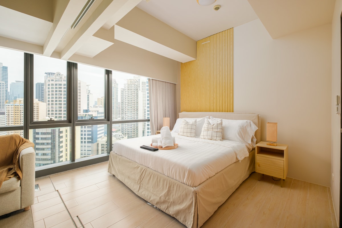 Enjoy a relaxing stay at this fully-furnished, with a great balcony view — Muji hōme-tél in the heart of Makati! HIGHLIGHTS: 55' UHD TV with Netflix and Disney+, LG Washer & Dryer, Cookware & Utensils, Dyson V15 Vacuum, Automatic Curtains & Digital Doorlock. The unit is located in Air Residences, an award-winning tower with its own Lobby Mall sitting along Makati's central business area, Ayala Avenue. Automatic: 5%off on a 1-week stay & 10%off on a 30-day stay.^^