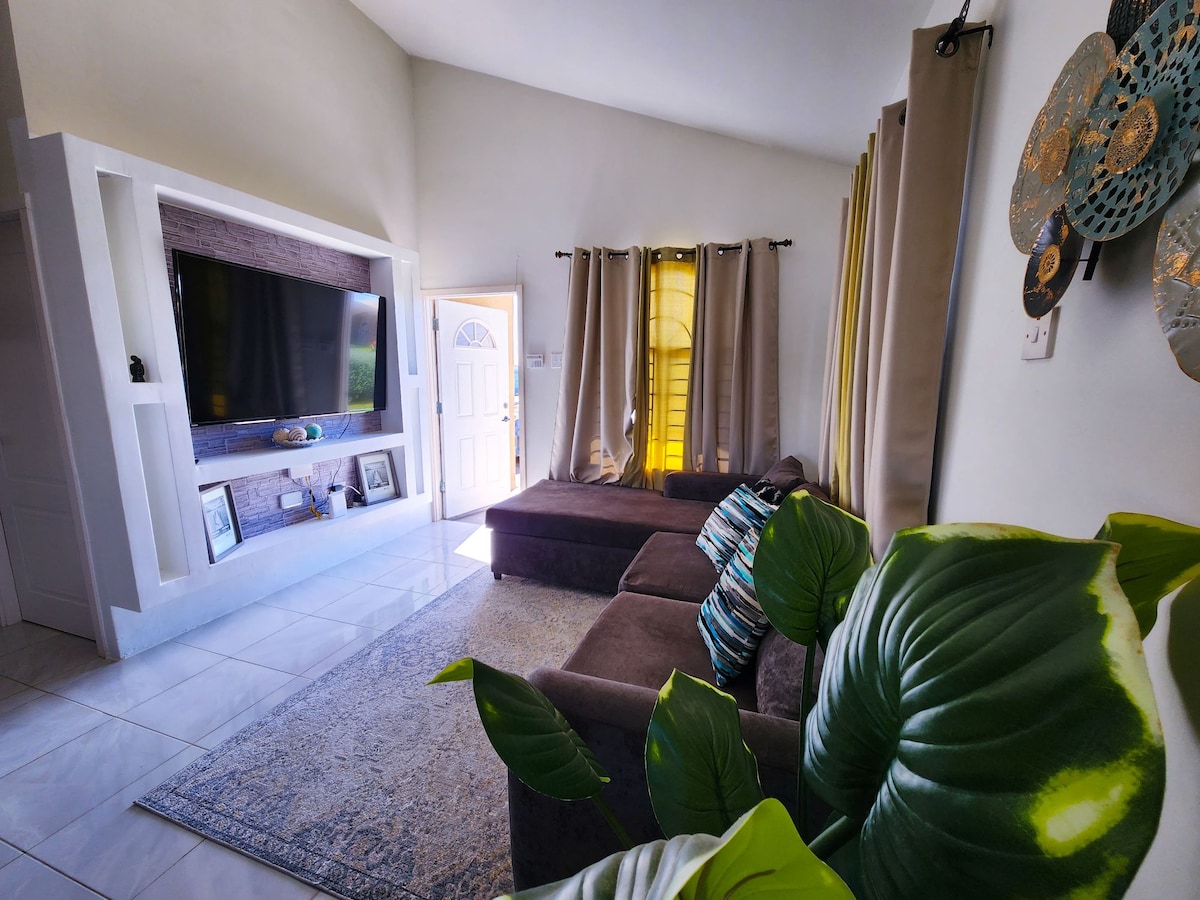 Step inside our modern home and discover a comfortable and stylish retreat. The Palms features 2 bedrooms and 1 bathroom providing ample space for you and your loved ones. Need to catch up on work or stay connected? No problem! We've got you covered with a dedicated workspace and reliable Wi-Fi. A 10-minute drive from the famous Hellshire beach, you can easily relax and soak up the sun, as well as easy access to shopping malls, restaurants, clubs, and all the other festivities the city offers.