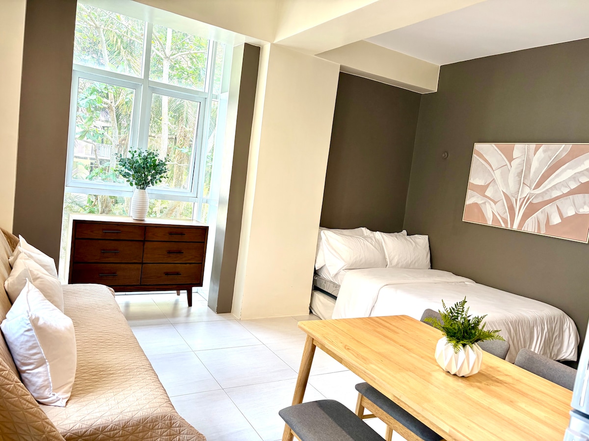 Relájate mientras estás rodeado de naturaleza en nuestra espaciosa unidad de 46 metros cuadrados recientemente renovada ubicada en el edificio Carola. Muy cerca de la playa y del club de campo. Pico de Loro es el resort de playa de clase mundial más cercano a Manila. Disfrutá de sus hermosas playas y aguas cristalinas con muchas actividades en interiores y al aire libre, como motos de agua, banana boat, bolos, billar, etc. para mantenerte ocupado durante toda tu estadía. Con conexión a Internet de fibra de 200 Mbps y Google TV de 55"