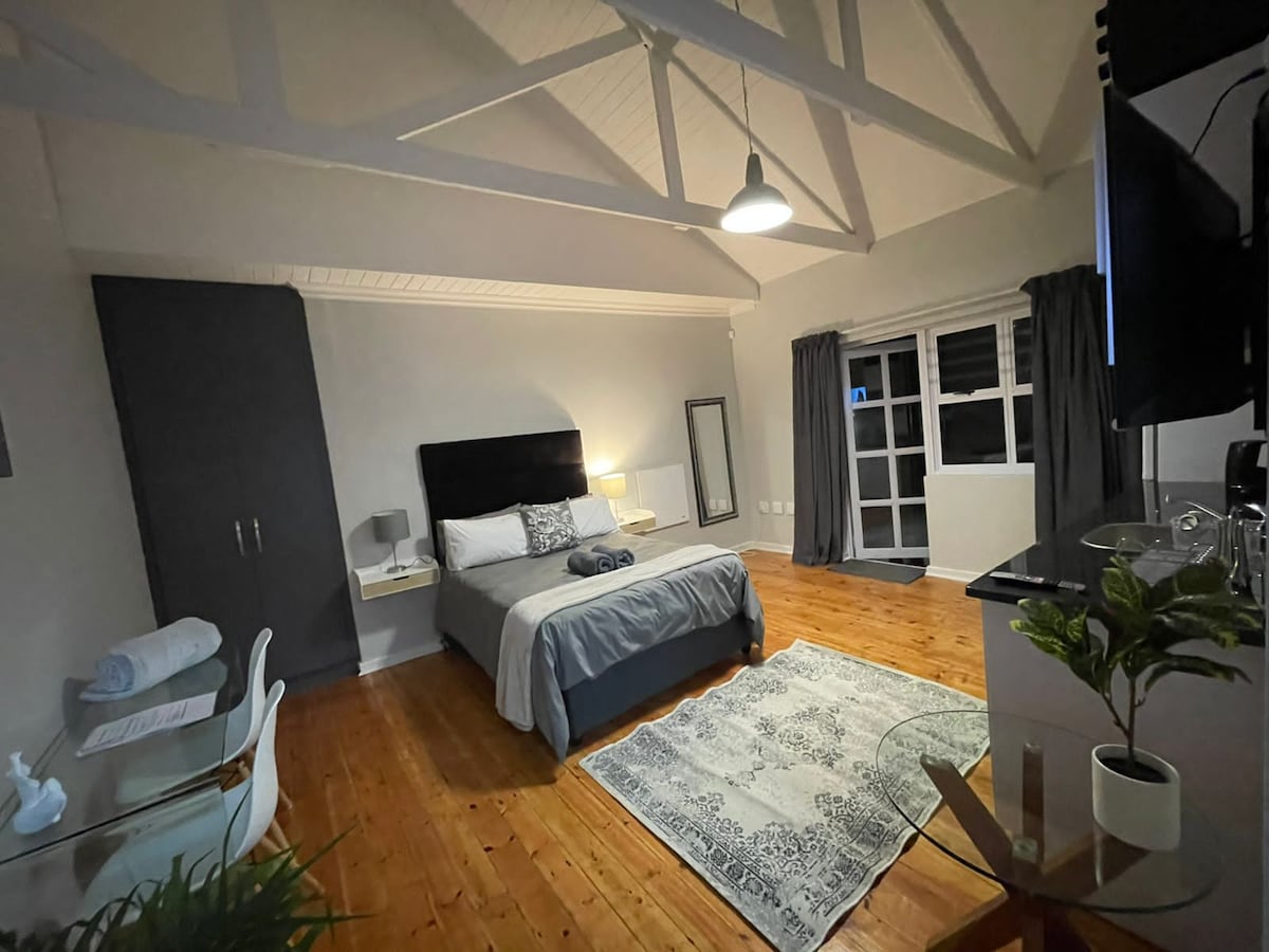 Open plan groundfloor unit with king bed or twin single beds, lounge with log fireplace, dining, kitchen area. Bathroom en-suite is shower only. Pet-friendly (see pet fees.) Option to convert to a family 4-sleeper with an adjacent double unit. Big Studio offers electric blankets, wallfan, hairdryer, tea-tray, free WiFi over fibre, ironing facility, Netflix, StayBasic Dstv available by prior request, or bring your HDMI cable for own streaming. We offer full bouquet Dstv in the main guestlounge.