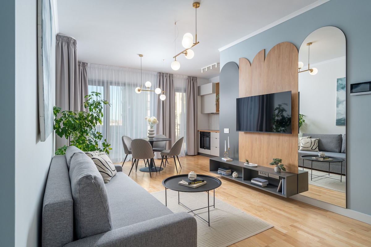 Moderno apartamento de 2 habitaciones en la Torre Aviației, junto al Museo de la Aviación. Elegante diseño contemporáneo, acabados prémium. Amplio dormitorio + cómodo sofá cama. Smart TV, Netflix y wifi de alta velocidad. Cocina totalmente equipada Aparcamiento privado y seguridad las 24 horas, los 7 días de la semana. A minutos del centro comercial Promenada y de los principales centros de negocios. Acceso rápido al parque Herăstrău y al aeropuerto. Check-in flexible para una estancia cómoda.