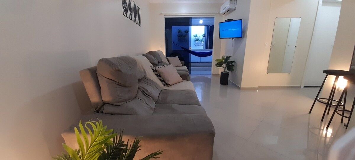 Departamento sofisticado y totalmente equipado. Decorado con encanto y comodidad para que tu estadía sea completa! ¡Tiene un balcón gourmet con vistas al vestuario! ¡Lugar tranquilo y silencioso! Súper ubicación... a 60 metros del vestuario. Wifi gratuito y televisión inteligente. 2 lugares de estacionamiento privado gratuitos. Las habitaciones y la sala de estar/cocina tienen aire acondicionado. ¡Vinos disponibles para el consumo y con valor reducido!