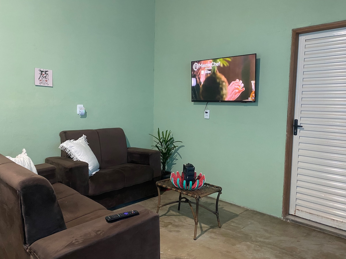 A CASA CHARME DO CERRADO é maravilhosa, próxima ao centro, aconchegante e familiar, possui 3 quartos, sendo 1 suíte e todos com ar condicionado, 1 cama de casal, outra de solteiro, enxoval completo de cama e banho, araras, maleiros e cortinas blackout. Sala com smart tv,,Sky, Netflix e wi-fi; Cozinha completa; Lavabo; Área de lazer com churrasqueira, freezer, piscina aquecida (solar), cascata e espreguiçadeiras; Redário; Garagem para 3 carros.