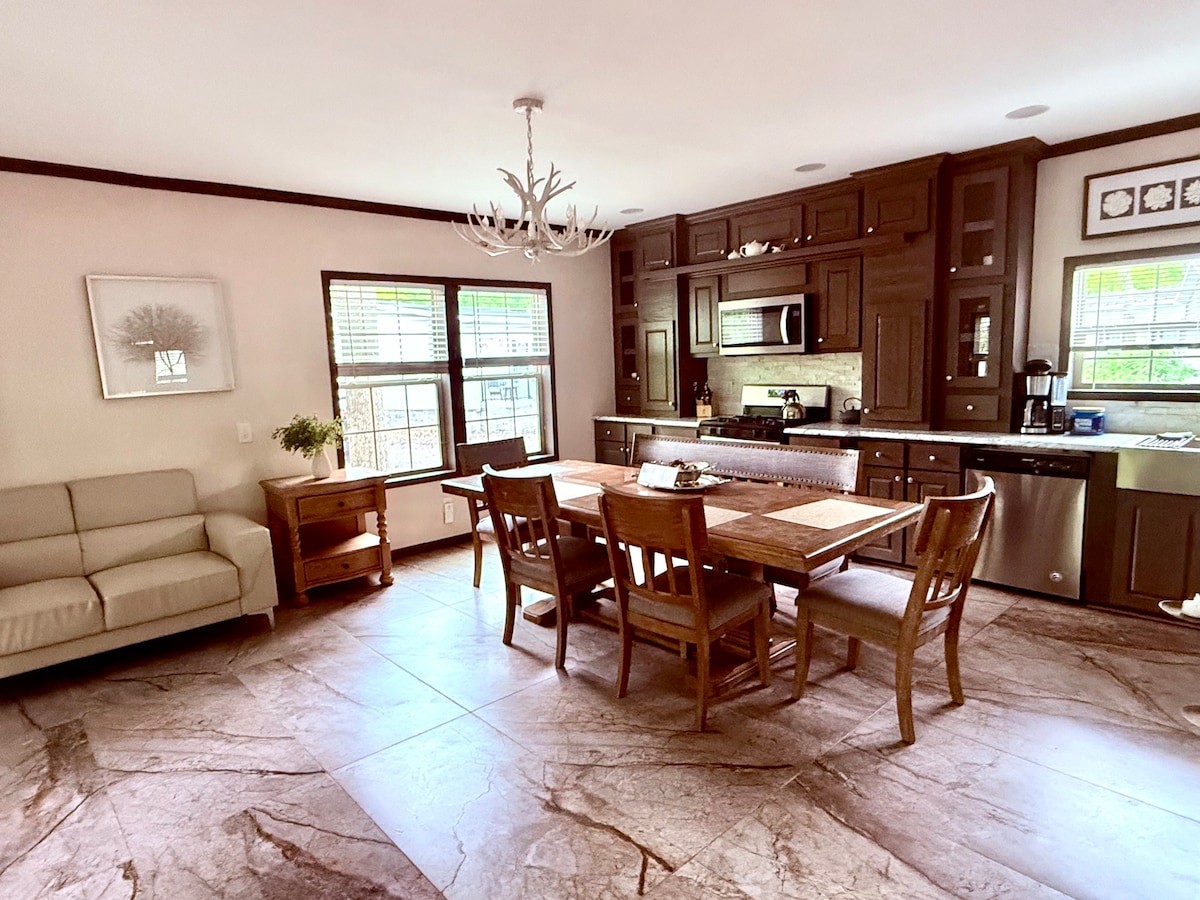 The home was created for that perfect couples getaway with it large comfy king bed on adjustable frame which looks one to barnyard doors. They open to an elegant chandelier lite soaking tub complete with the bubbles . On the his and her vanities you will find robes and towels for your use as well as other soaps and sundries ( robes are available for purchase). Of course there is also a shower and washer and dryer . Your 4 legged family are complementary but limited to 2 max 50lbs