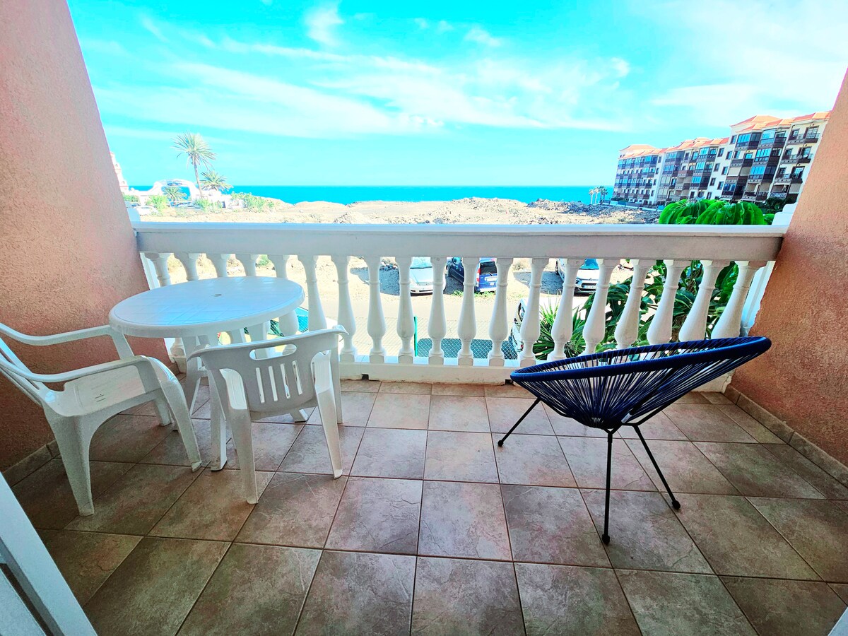OASIS DORADO FRENTE A LA PLAYA. Apartamento de lujo recién renovado, perfectamente ubicado y totalmente amueblado con terraza privada con vistas al océano Atlántico y a solo unos pasos de la playa Playa Amarilla. Tranquilo y lejos de zonas concurridas, pero cerca de supermercados y restaurantes. A solo 15 minutos en coche del aeropuerto de Tenerife Sur. Aparcamiento gratuito justo debajo del apartamento. Piscina comunitaria. Superanfitrión experimentado con más de 2200 reseñas.