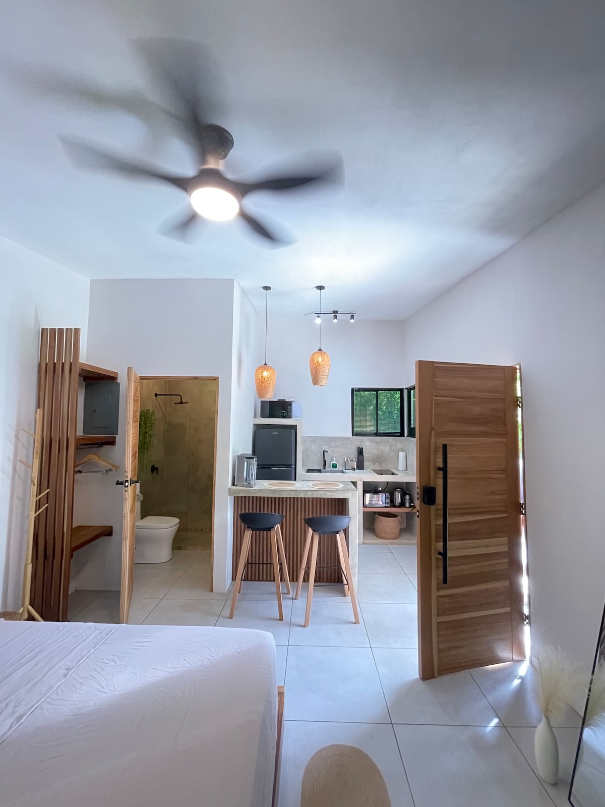 Este estudio privado es un refugio íntimo rodeado de jungla, ideal para quienes buscan tranquilidad, diseño y conexión con la naturaleza. El espacio combina madera, concreto pulido y cerámica artesanal, creando un ambiente elegante y acogedor. Cuenta con cama queen, cocina equipada, baño con ducha estilo artesanal y terraza privada para disfrutar del entorno verde. Un lugar pensado para desconectar, bajar el ritmo y vivir el Caribe de forma consciente en este espacio tan tranquilo y elegante.
