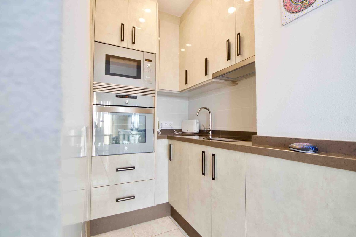 Apartamento bellamente decorado con todas las comodidades para hacer que su estancia sea cómoda. Disfrutar desde el primer minuto, ese es nuestro objetivo. Justo fuera del complejo tienes el mar, la playa, tiendas, bares, restaurantes, parada de autobús, etc. y todo esto a poca distancia. Gran terraza con TV y sillas de descanso para relajarse, cocina totalmente equipada, hermosa sala de estar con cama supletoria con topping.