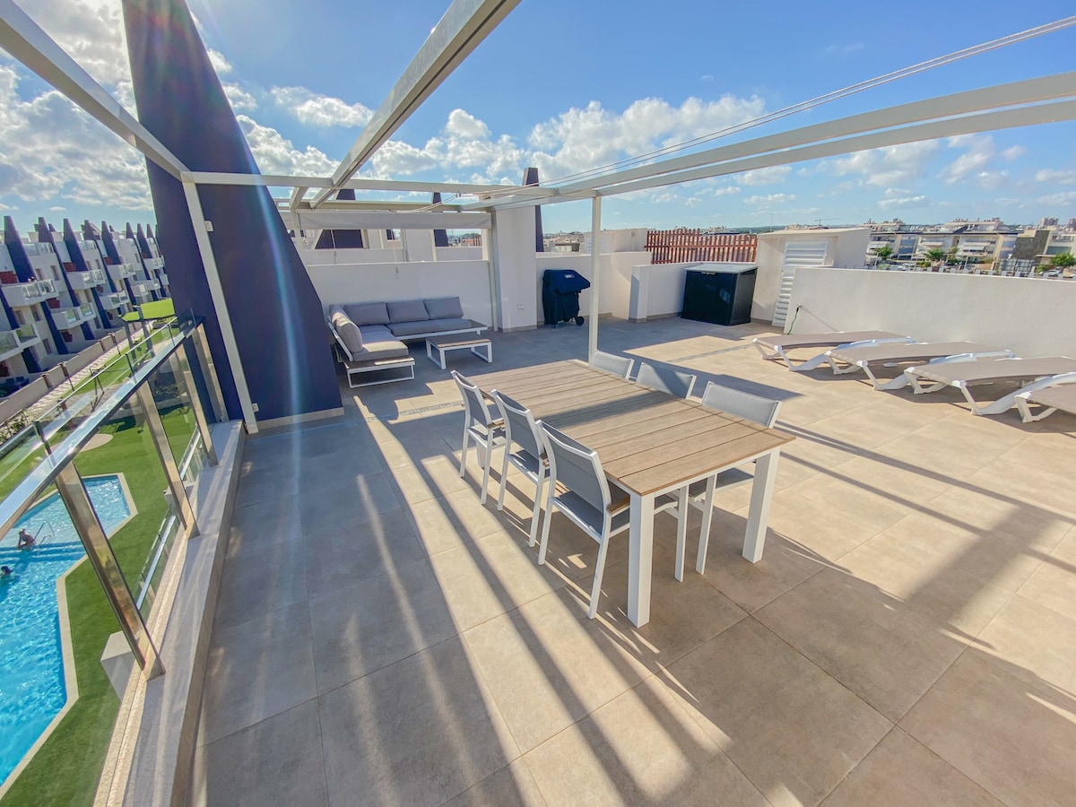 This luxury penthouse is a 8-minute walk from the famous beach Mil Palmeras. Elisa Bay is located in Pilar de la Horadada. Built 2017. Free WiFi. The 2 bedroom apartment has a kitchen and dining area, two bathrooms, dishwasher, washing machine, flat-screen TV, DVD player and aircondition. Zara Home details like towels, pillos etc. Air-condition in all rooms. Two big terraces. 5 outdoor pools. Shopping center. Restaurants. Locked community area for your security. Airports: Murcia and Alicante