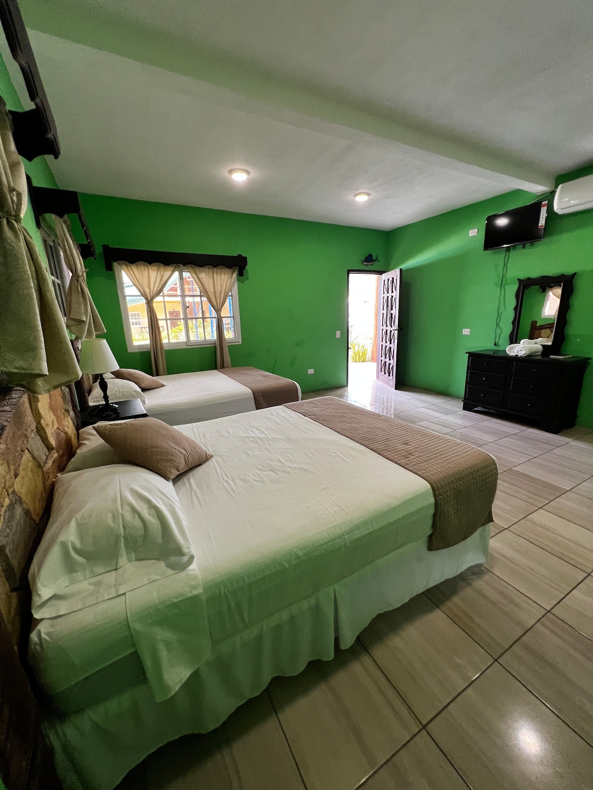 Tenemos 3 preciosas habitaciones que cuentan con baño privado, A/C, Smart TV y balcón. Hab. #1A: 2 camas matrimoniales para 4/p. Hab. #2A: 1 cama tamaño Queen para 1 ó 2/p. Hab. #3A: 2 camas tamaño Queen para 4/p. Tenemos un área con mesas, sillas y asador que pueden utilizar sin costo extra. La playa se encuentra a 200 m del hotel, pueden ir caminando si la marea lo permite o por medio de una lancha de pago en un viaje de 3 minutos. Pueden bañarse en la playa pública o en la bocabarra.