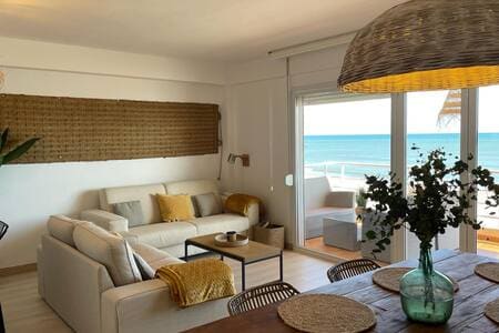 Precioso Apartamento en PRIMERA LÍNEA DE PLAYA, con Parking cerrado(2 coches). Dos terrazas, una frontal al mar y otra trasera. Disfrute de nuestros 120m2 con 4 dormitorios y un total de 10 plazas; Aire acondicionado, Alexa, Netflix, Wifi gratuito, toallas de ducha, y playa, Hamacas y sombrillas para la playa, tostadora, exprimidor, microondas, lavavajillas, lavadora. Dos baños. Suelo de parqué. Salida directa al mar. LICENCIA TURÍSTICA: ESFCTU000046044000393214000000000000000000VT-54466-V3