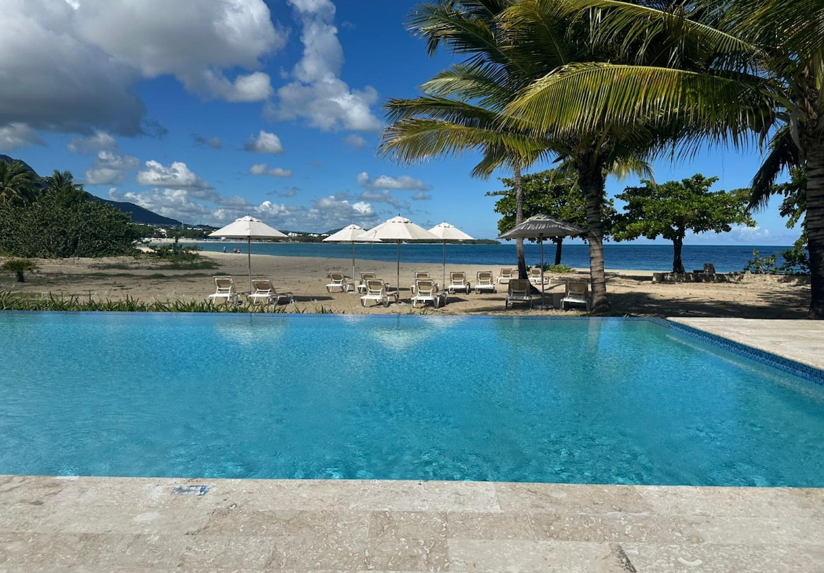 Departamento frente a la playa seguro, limpio, con 2 dormitorios y 2 baños. Esta unidad se renovó por completo. Tiene una cocina completa con un concepto abierto que fluye hacia el espacio habitable. Esta unidad se encuentra en la parte trasera del complejo y tiene vista al mar desde el balcón o el dormitorio principal. La piscina privada y el acceso a la playa te dan todo lo necesario para disfrutar de tu estadía. Para tu comodidad, hay disponible un servicio opcional de limpieza y lavandería todos los días.