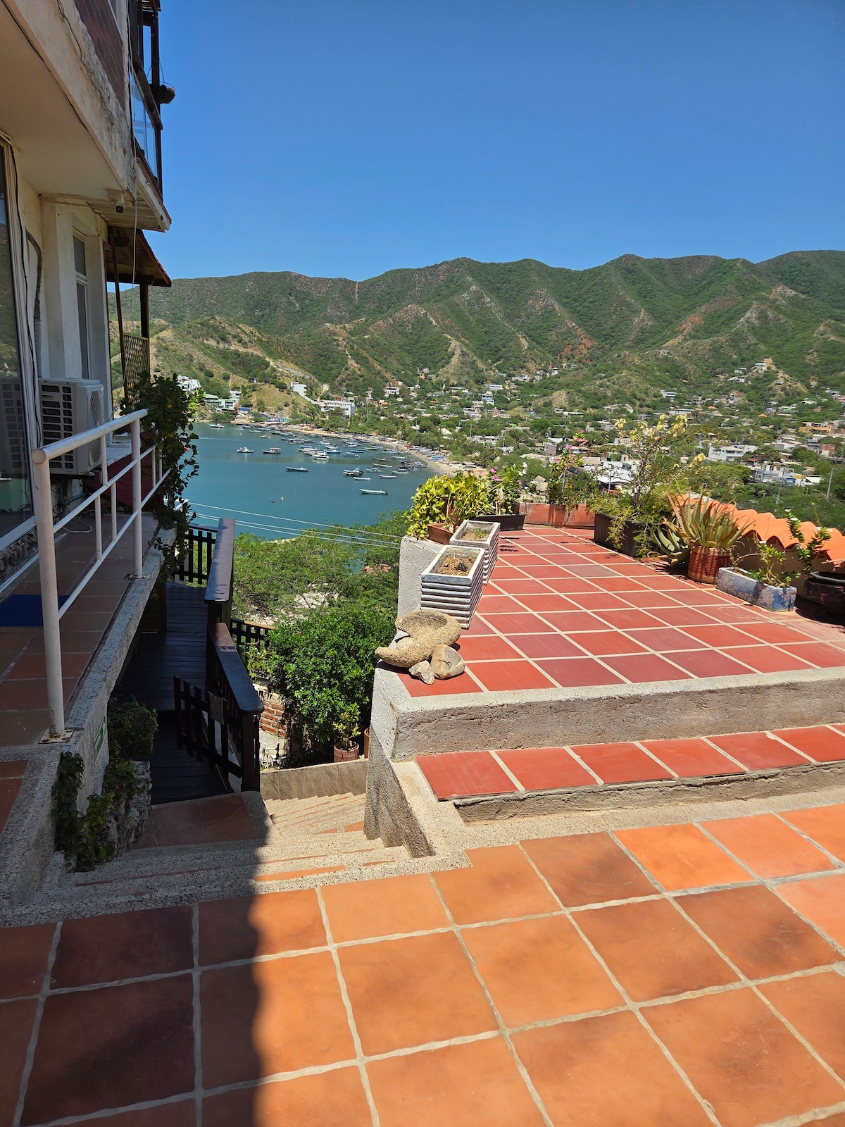 Espectacular cabaña tipo chalet suizo con vista excepcional a la bahía de Taganga. un lugar entre las montañas con todas las comodidades. La vusta bellisima tiene segundo piso pero el aire acindicionado esta en el primer piso no tiene television pero tiene una mesita para trabajar adentro y una afuera en la terraza con una hermosa vista el balcon mide 1.80 por 3.0 metros de ancho.