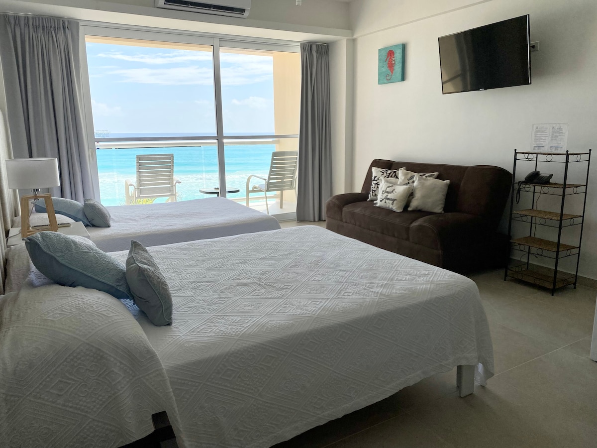 Recently remodeled, direct Beach View Studio apartment, located in the most alive area of Cancun's Hotel zone but still great for relaxing, km 9.5, right next to the hard rock cafe, 24/7 convenience stores near, 24/7 bus services right in front & walking distance from the party zone where all the best clubs/discos are located and of course the amazing turquoise Caribbean an elevator ride away.