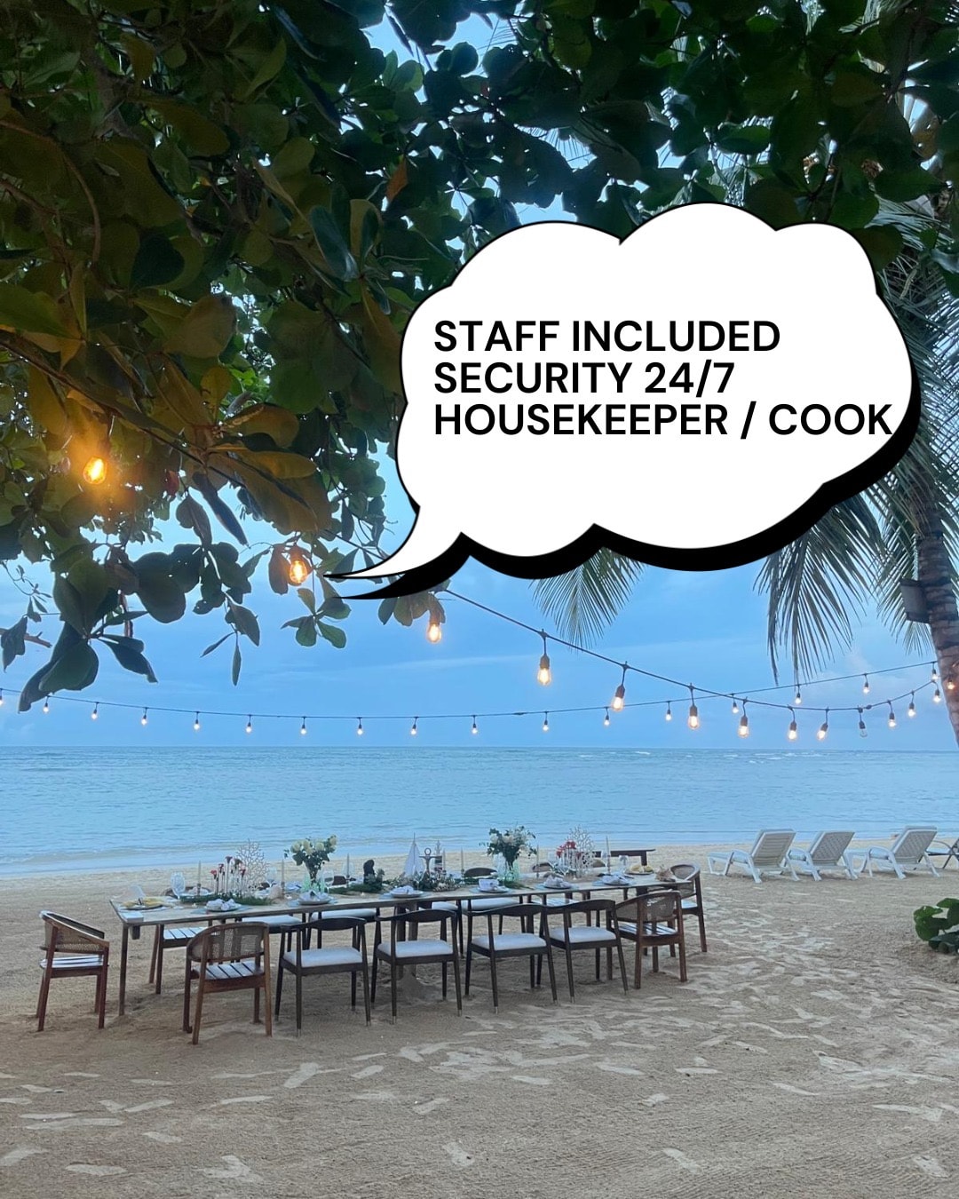 Villa situada en primera línea de playa, en una urbanización privada con seguridad 24/7. Acceso directo a la playa desde el jardín. Dispone de piscina privada, parking en la propiedad, wifi, Salón de TV, gran terraza para comer y descansar, 2 habitaciones en la planta baja y una master suite de más de 100 m2 en la primera planta, cada una con su baño privado. Villa totalmente equipada con ropa de cama, almohadas y toallas para baño y piscina. Servicio de limpieza, jardín y piscina incluidos.