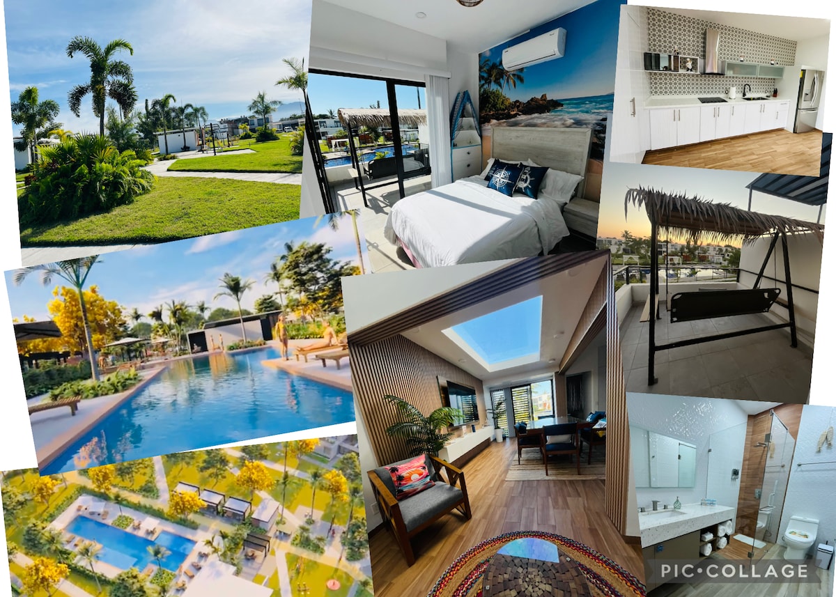Estudio de Lujo a metros de la Playa. Ven a vivir las vacaciones que siempre soñaste en este nuevo Loft ubicado en el corazón de San Pancho. Villa Dahlia , esta en el segundo nivel frente a la Alberca y tiene una parcial vista al mar. Relajate y disfruta de todas las amenidades que tiene el desarrollo, acceso directo a la playa, alberca climatizada, jacuzzi, gimnasio y mesa de ping pong. Disfruta de tu cafe en las mañana sintiendo la brisa del mar y sorpréndete con los mejores atardeceres.