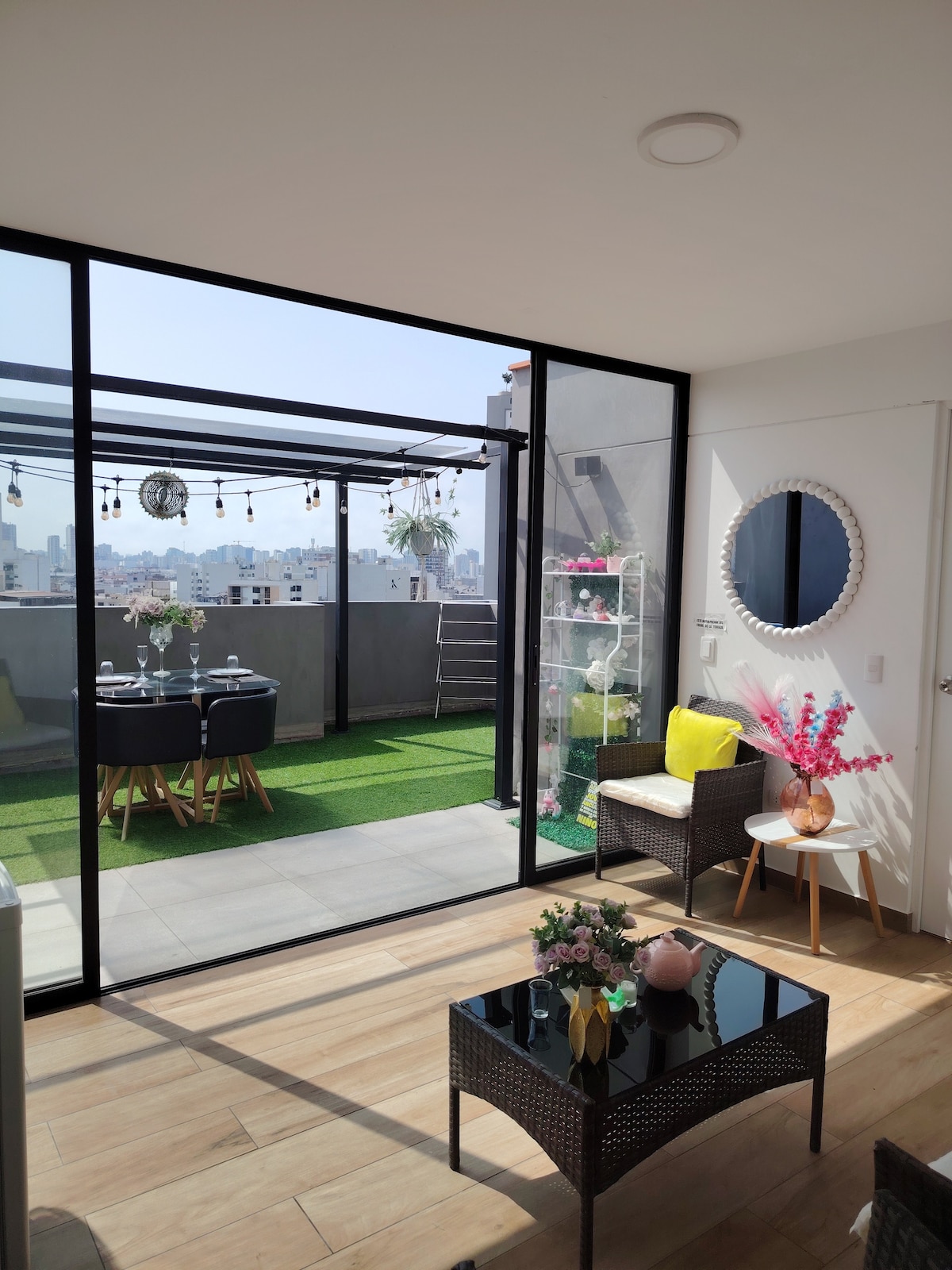 Moderno depa full amoblado ideal para largas estancias. Smart TV 65" con Netflix y Disney+, wifi rápido, cocina equipada con cafetera espresso, lavaseca, cama queen, agua caliente y balcón a la calle. Piscina, gym, coworking, autocheck-in 24/7, estacionamiento y seguridad 24h. ¡Incluye café y galletas de cortesía!