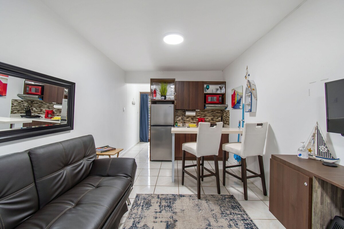 ¡Experimenta la máxima relajación y el encanto isleño en este estudio bellamente decorado! Disfruta de una cómoda cama queen, un baño completo y una cocina totalmente equipada para todas tus necesidades culinarias. Sal a tu terraza para disfrutar de las tranquilas vistas al jardín, perfectas para un café por la mañana o relajarte por la noche. Hay un colchón de aire disponible para acomodar a un tercer huésped por solo $20 adicionales al día. ¡Tu retiro perfecto en Puerto Rico te espera!