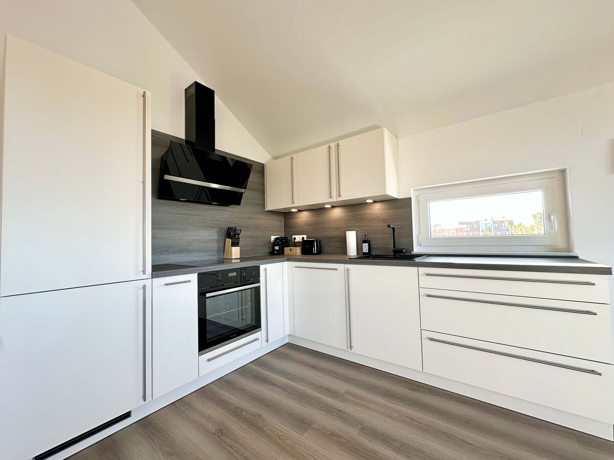 Lehnen Sie sich zurück und genießen Sie entspannte Tage in dieser stilvollen, lichtdurchfluteten Unterkunft. Auf drei offen verbundenen Ebenen bietet die Wohnung ein großzügiges Raumgefühl. Die Galerie verbindet Wohn- und Schlafbereich und schafft einen besonderen Blick von der oberen Ebene ins Wohnzimmer. Im Erdgeschoss erwartet Sie eine moderne Küche mit integriertem Essbereich – perfekt zum Ankommen und Wohlfühlen.