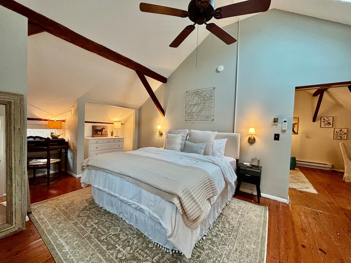 Historic Hope NJ: granero de campo de 2 pisos con capacidad para 1-4 personas; cocina y baño nuevos El loft tiene una cama tamaño king y almacenamiento para ropa. El segundo dormitorio tiene un futón doble. Nueva terraza al aire libre con capacidad para 4 personas; Wifi y acceso a teléfono móvil. Ideal para solteros, parejas, viajeros de negocios, padres visitantes, kayakistas, excursionistas, ciclistas, planeadores, amantes de la naturaleza, etc. Cerca de Delaware Water Gap, Wolf Preserve, mercados de agricultores, antigüedades, Appalachian Trail, Nature Center, Land of Make Believe, Blairstown y Blair Academy: