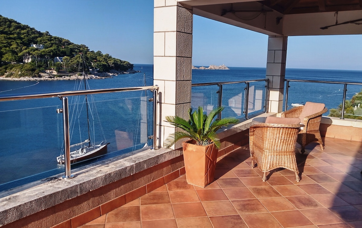 Villa de lujo Sol del Mar II. Te da la bienvenida a una estancia inolvidable rodeada de elegancia y lujo a solo un par de pasos del mar Adriático. Villa Sol del Mar II es un lugar verdaderamente mágico y una propiedad única con una vista impresionante del cristalino mar Adriático. Situada en la pintoresca, tranquila y pequeña ciudad costera de Slano en la Riviera de Dubrovnik, a solo 33 km del sitio del Patrimonio Mundial de Dubrovnik.
