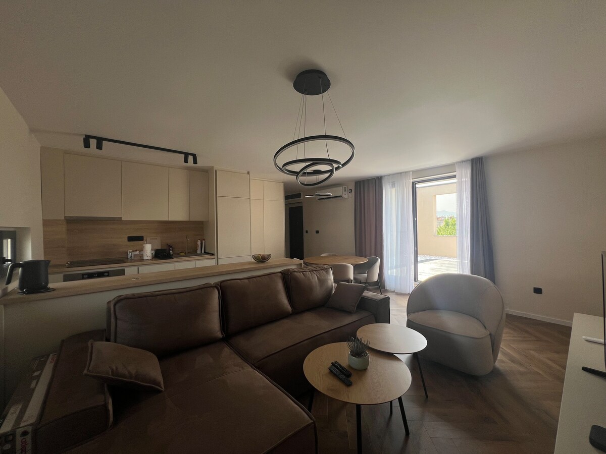 Relájate y desconecta en este nuevo y elegante espacio tranquilo. Si te gusta alojarte en un entorno moderno y acogedor, quieres comodidad y privacidad, estás en el lugar adecuado. Puedes alquilar un apartamento situado en el sexto piso, con vistas increíbles desde la terraza. Disfruta de tu estancia en nuestro apartamento de un dormitorio recién amueblado en Podgorica, cerca del aeropuerto, así como de la estación principal de autobuses y trenes. También está a poca distancia a pie del centro de la ciudad. Garantizamos tu comodidad y satisfacción.