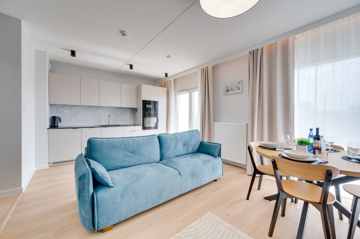 Estudio moderno con vistas al mar, 1 cama doble y 1 cocina individual totalmente equipada y baño. Nuevo, limpio y acogedor recomendado por muchos huéspedes. El edificio tiene un ascensor y una tienda de comestibles. El apartamento está súper conectado con el centro de la ciudad y la playa, tanto en el centro de Gdynia, así como en Mechelinki y Rewa. El estudio también es un buen punto de partida para la península de Hel.