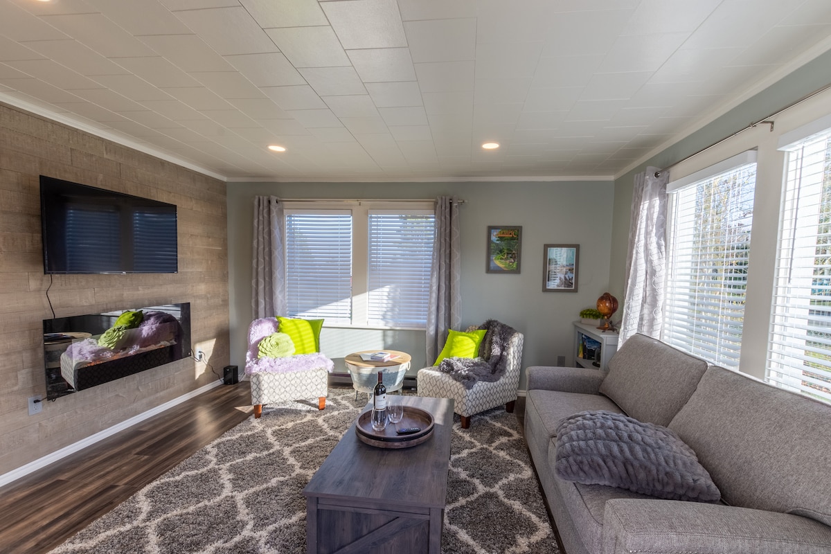 Un bungalow de 2 dormitorios y 1 baño ubicado a medio camino entre la entrada del Parque Nacional Olímpico y el centro de Port Angeles. A media milla del centro de visitantes del ONP, a media milla del sendero Olympic Discovery, a media milla del paseo marítimo y a 1 milla del muelle, nuestro lugar es fácilmente accesible a pie, en bicicleta o en coche. También cerca: Hurricane Ridge, campos de lavanda de Sequim y Victoria B.C. Somos una escapada perfecta para corredores de senderismo, ciclistas de montaña, navegantes, artistas y nuestros vecinos canadienses. (Ten en cuenta que estamos en una calle concurrida)