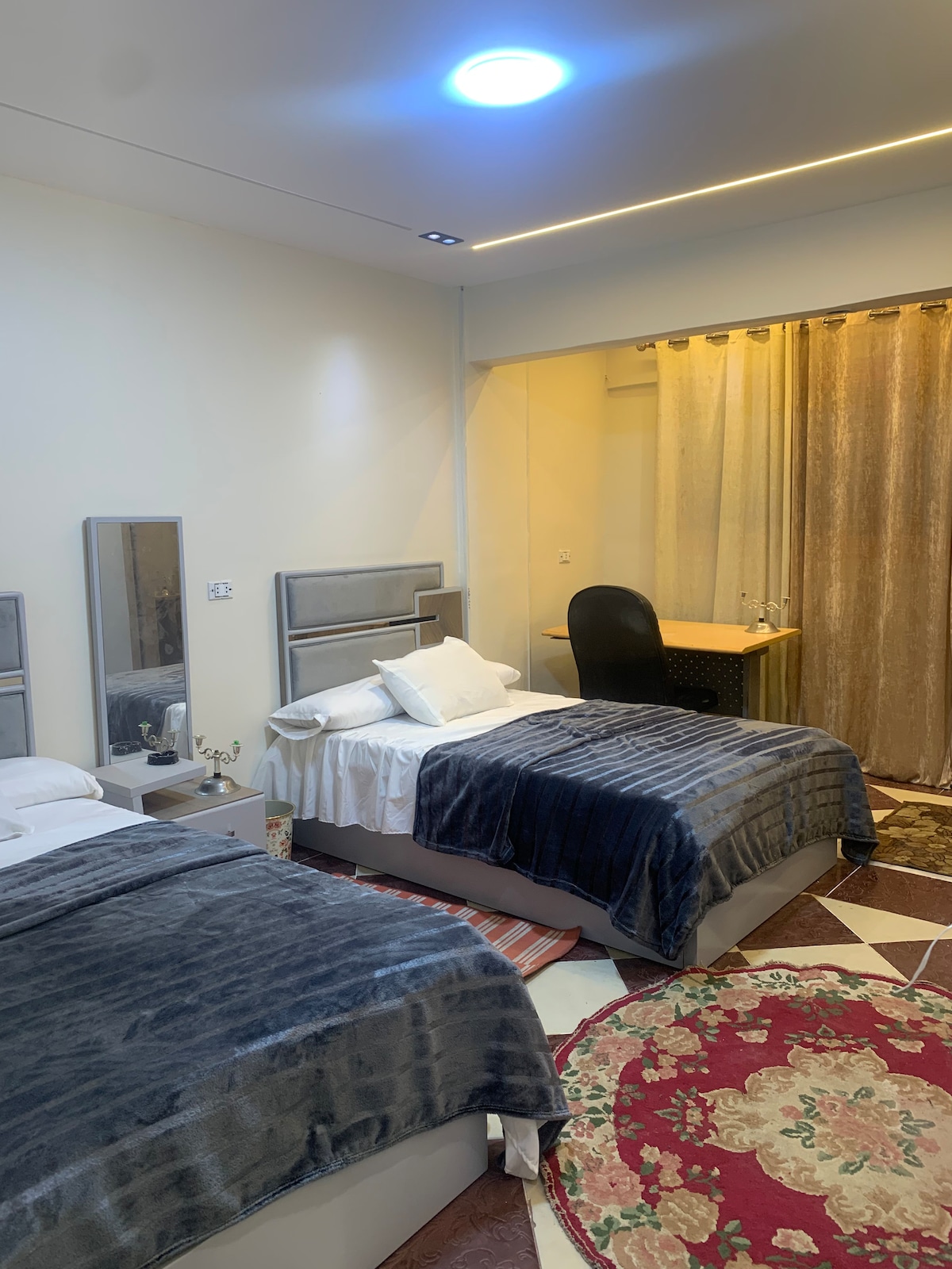 Enjoy a peaceful stay in this spacious apartment located in the heart of Port Said. The area is calm and quiet, yet everything is within reach. Supermarkets and local shops are just 100 meters away, and the beach is only a 5-minute walk. The apartment includes three rooms: a main bedroom with two double beds that can be combined into a king bed, a second bedroom with a single bed, and a third room with a desk and dining area. Ideal for families, couples, or business travelers.