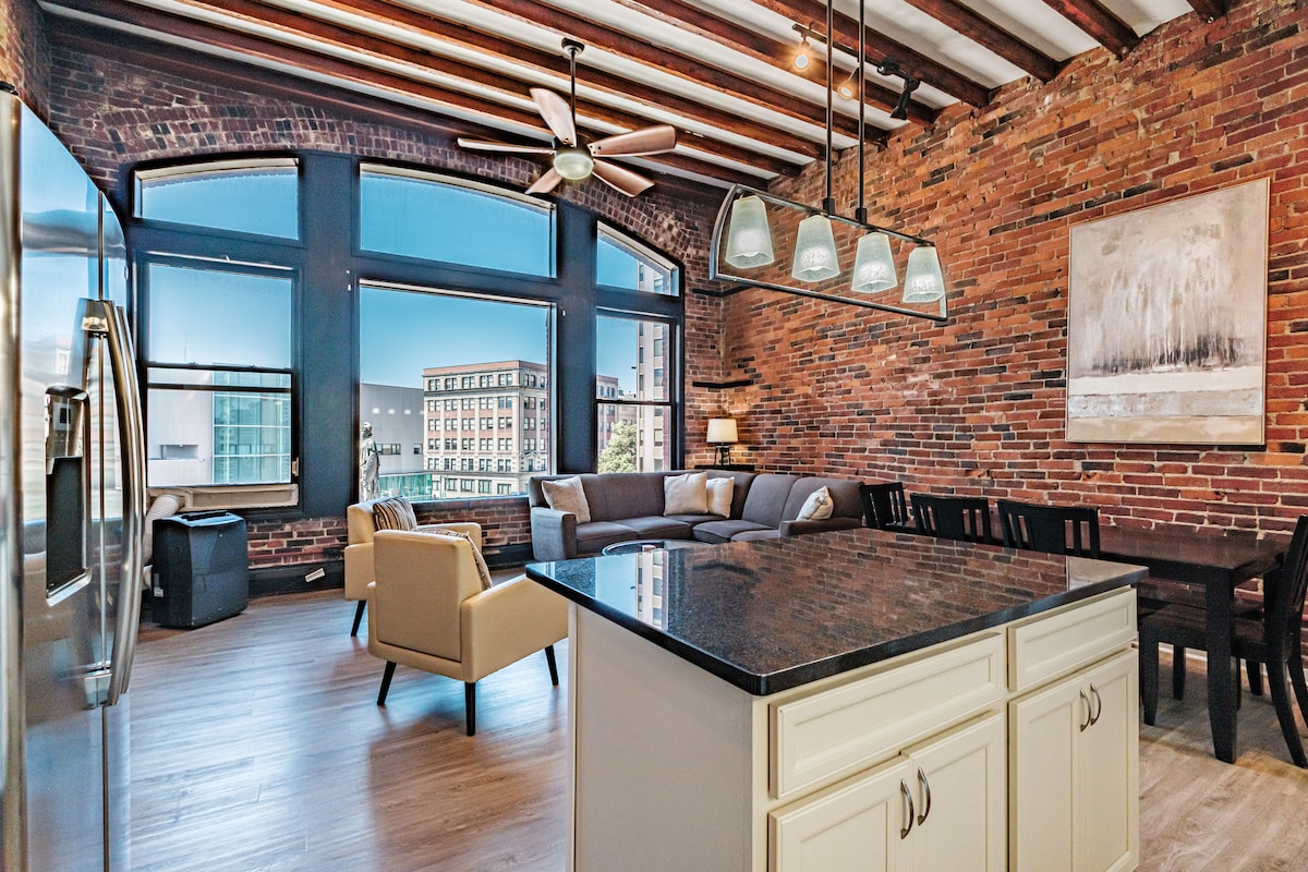 Con el Museo de Arte de Portland y el Teatro Estatal a 5 minutos a pie, el Puerto Viejo a solo 15, este impresionante apartamento está a solo unos pasos de los mejores restaurantes, arte y tiendas que la ciudad tiene para ofrecer. Cuando llegues, aparca tu coche en la plaza de aparcamiento privada y olvídate de él por un tiempo. Construido en 1835, este soleado y espacioso apartamento de segunda planta cuenta con techos de 14 pies y suelos de madera originales. Un baño para él y otro para ella están conectados con una ducha de azulejos de piedra.