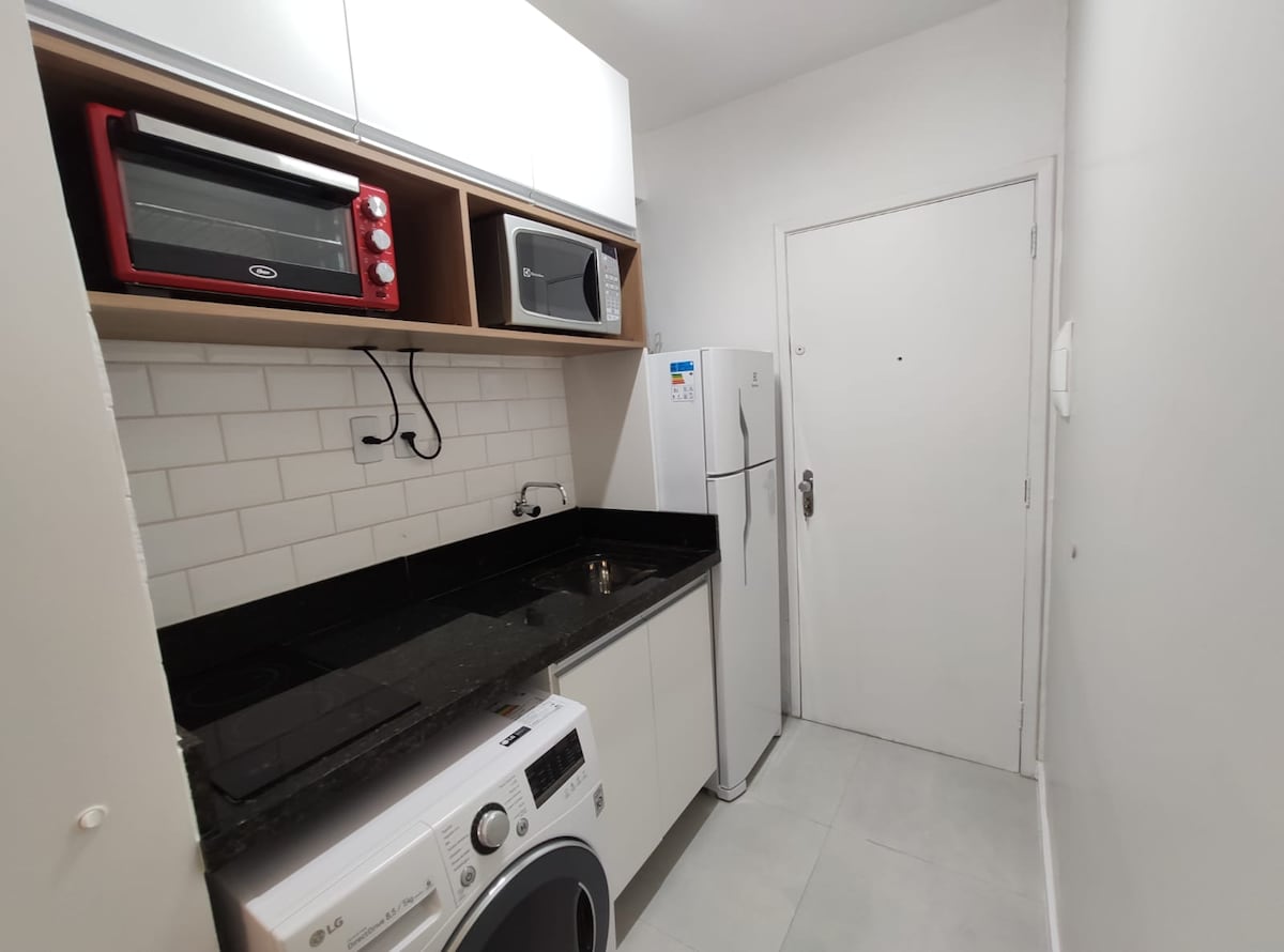 Ideal para estancias cortas o largas, nuestro estudio ofrece un entorno integrado que combina cocina, sala de estar y dormitorio con practicidad y comodidad. Tiene una cama queen y un sofá cama. El espacio cuenta con aire acondicionado, TV inteligente, espejo de cuerpo entero, mesa con dos sillas y una cocina completa para tus comidas diarias. El baño es privado y tiene una ducha cómoda y un secador de pelo. 2 estacionamientos al lado del edificio, a menos de 50 metros. Diariamente entre 35 y 60 reales.