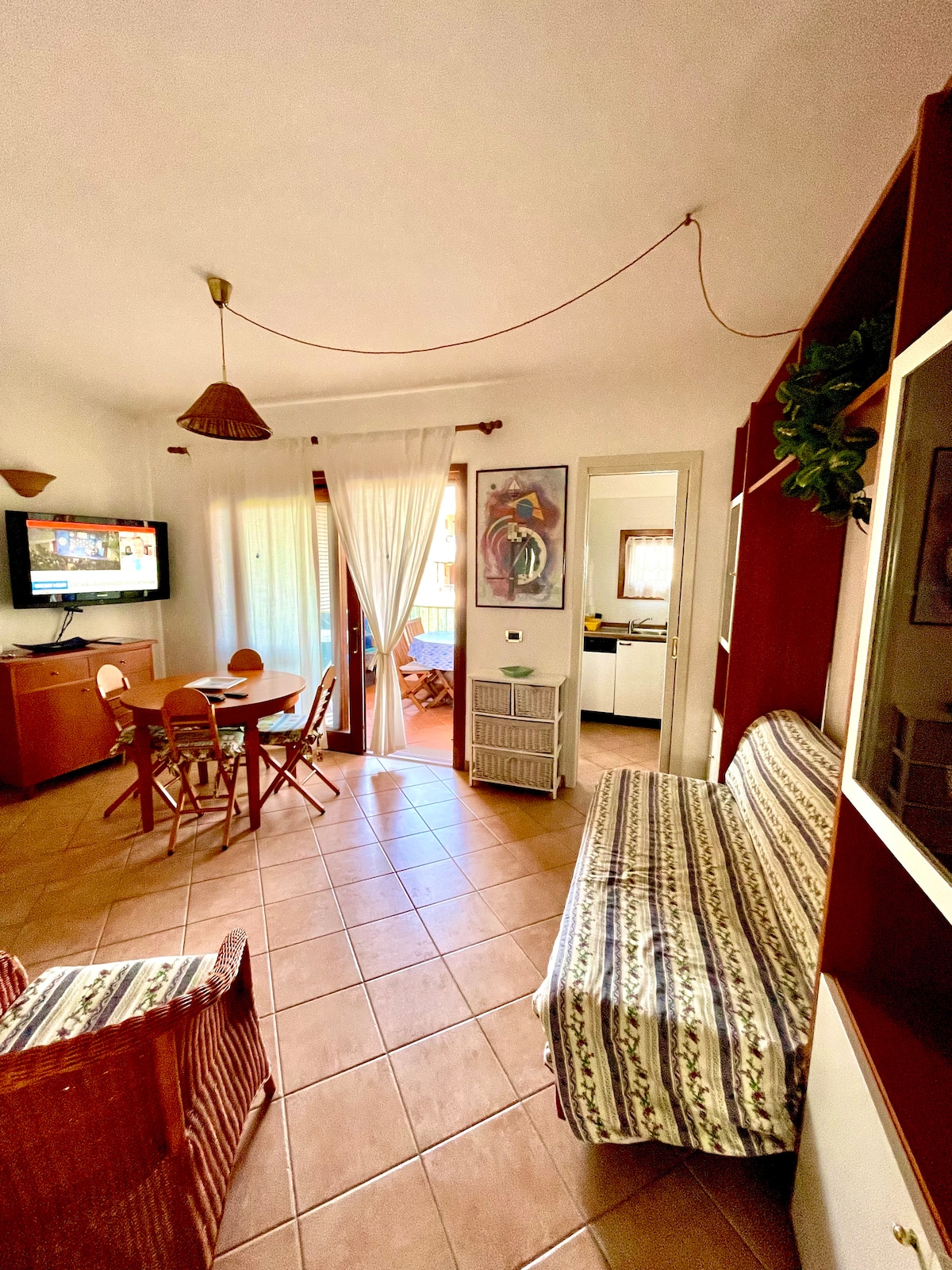 Apartamento de dos habitaciones en el primer piso para un máximo de 4 personas, totalmente amueblado, que consta de una sala de estar con sofá cama doble y cocina americana, dormitorio doble, terraza y aparcamiento privado. Ubicada en una zona estratégica, cerca del aeropuerto Costa Esmeralda a 2 km y del puerto a 3 km, la zona es tranquila y está bien servida a pie, se puede llegar al Centro Comercial Olbia Mare y a 300 metros se encuentra la parada de transporte público para el centro de la ciudad y las playas.