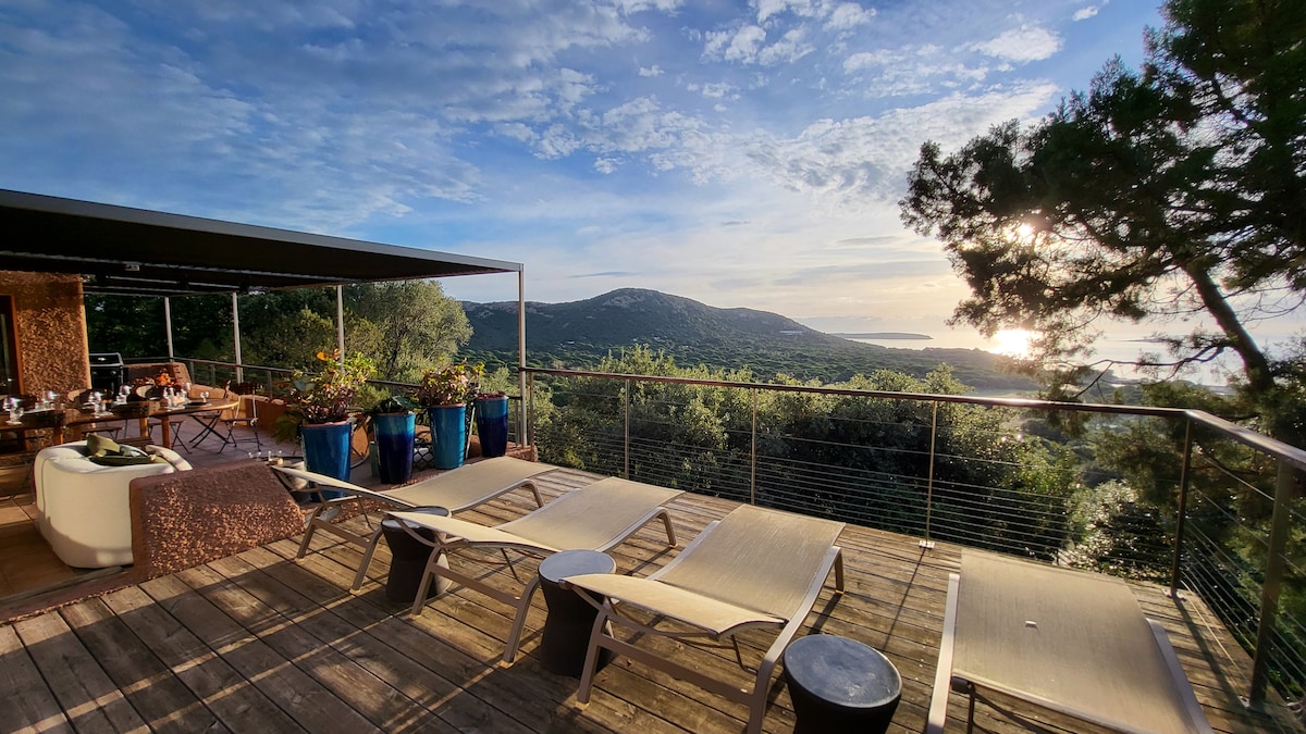 VILLA PANORAMIQUE avec VUE IMPRENABLE SUR MER ET PLAGE DE PALOMBAGGIA. Située sur les hauteurs de l'hôtel Relais & Châteaux Les Bergeries de Palombaggia, notre Villa - toute équipée - vous propose 4 chambres, une grande pièce de vie avec une terrasse proposant bains de soleil et jacuzzi, et tout le confort nécessaire pour faire de vos vacances, un moment privilégié au milieu du maquis corse. La plage , à 700 m de notre villa, est accessible en 15 min, par un chemin privé à pieds.