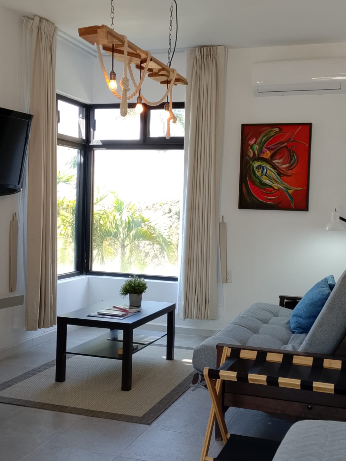 Precioso y espacioso apartamento con vistas desde el tercer piso. La cocina está totalmente equipada y cuenta con una parrilla de inducción eléctrica para tu seguridad. El apartamento forma parte de una zona residencial (Club Residencial Riberas del Chante) que ofrece seguridad las 24 horas y el uso de piscina, piscina infantil, jacuzzi (mayores de 18 años), parrilla, campo de fútbol, cancha de tenis y baloncesto. En la sala de estar hay una televisión con Total Play.