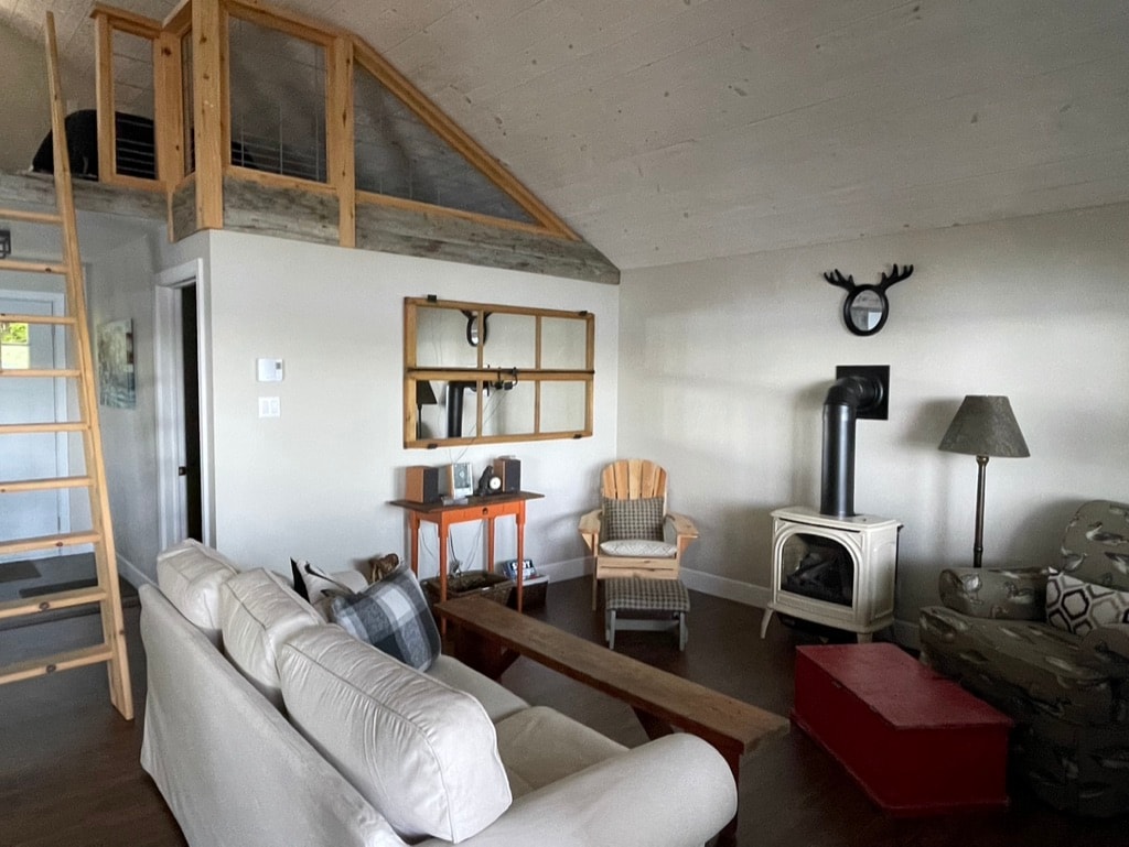 Monumental open concept, in the heart of nature. Access to trails directly behind the house. Wood stove, large modern bathroom, one bedroom + sofa bed. Another sofa bed in the living room. Ideal chalet for a couple with children or two couples. Wild birds, turkey, and deer lovers welcome! Wifi and EV charger included. Dogs Welcome! CITQ : #308038