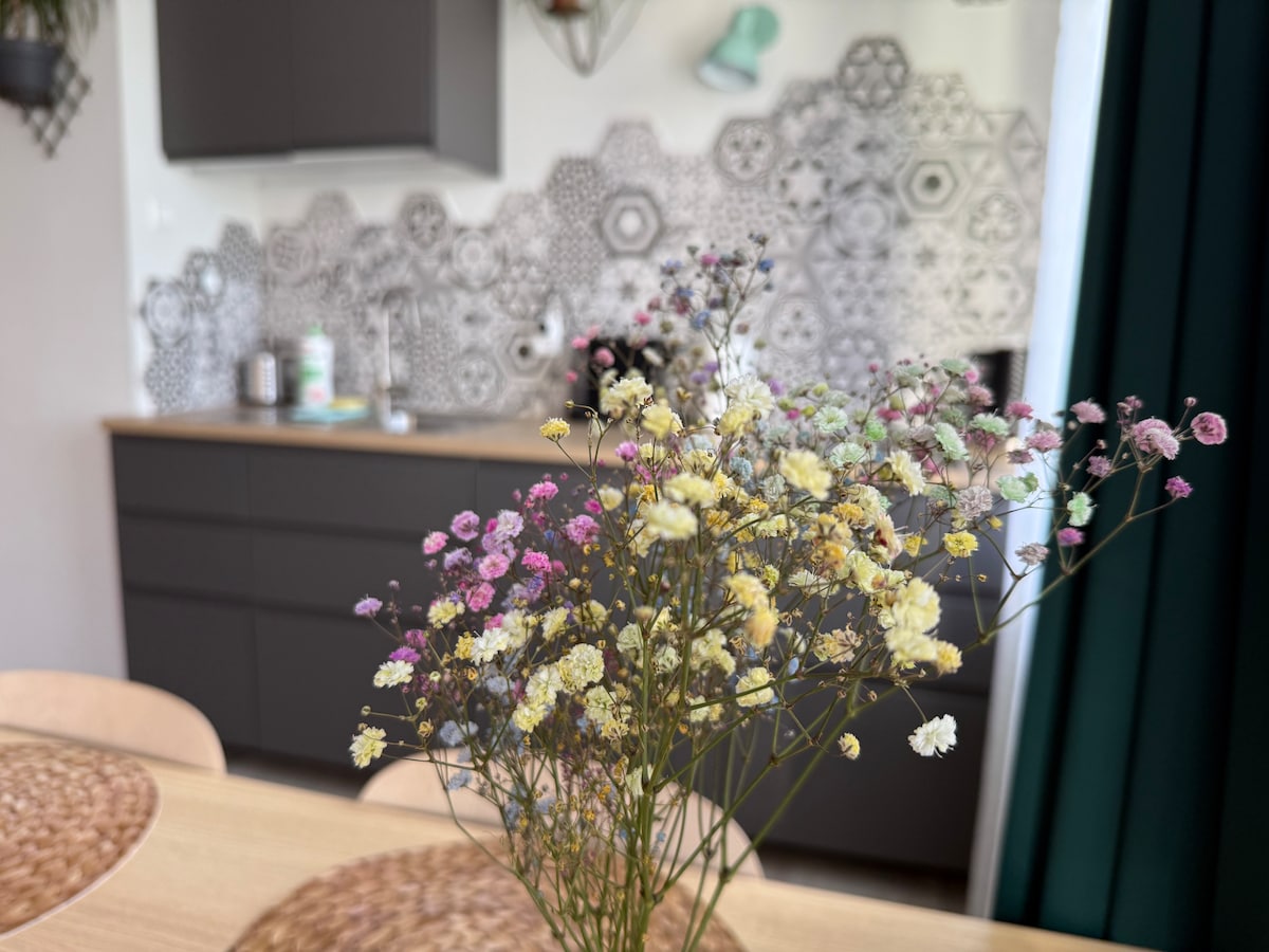 Apartamento original y funcional en Chicago con balcón y vistas al parque y a Stary Browar. El espacio de 32 m² incluye: – una zona de dormitorio separada y acogedora; – una sala de estar para relajarse; – una cocina americana totalmente equipada con lavavajillas; - un baño con ducha; – una plancha, tabla de planchar y lavadora disponibles para los huéspedes en la zona común. El apartamento se encuentra en una casa adosada en el tercer piso sin ascensor: escalones bajos, escalera ancha.