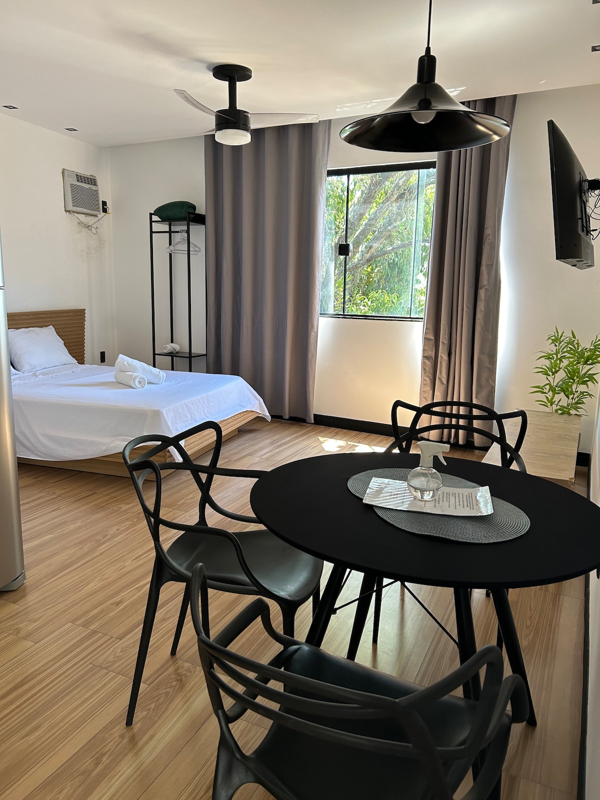 Studio totalmente privado, ideal para trabalhar em home office, descansar e relaxar, fica junto a natureza da Barra de Guaratiba, em uma das várias ladeiras do bairro. mas não é ingrime. É um espaço em conceito aberto, com ar condicionado, ventilador, cozinha (sem fogão), microondas e frigobar, e um banheiro moderno privado dentro do Studio, a janela tem vista parcial para Restinga e Praia da Marambaia, e um estacionamento conforme mostrado nas fotos. Fornecemos também roupas de cama e banho.