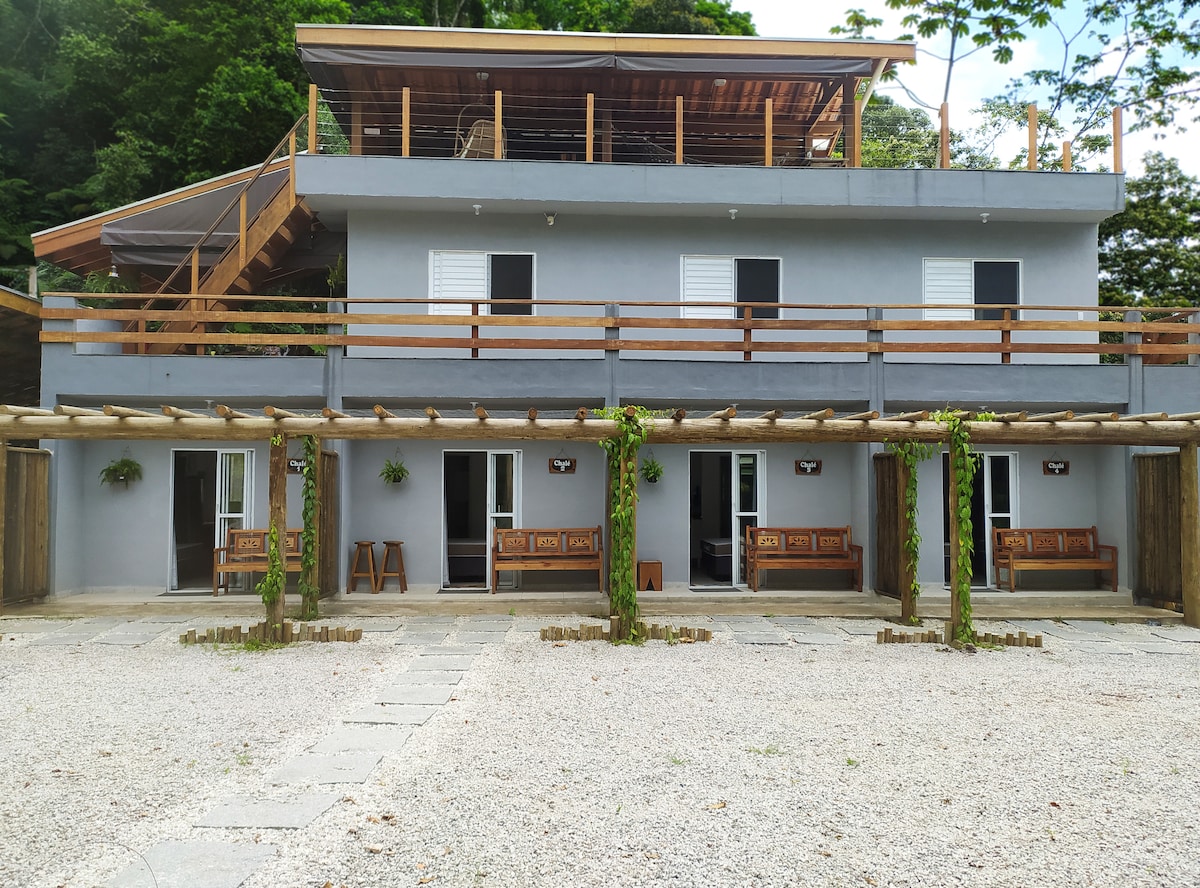 Charmosos estúdios self catering na linda praia do Prumirim. Entrada independente, pátio privado, cozinha totalmente equipada, cama queen size de alta qualidade, sala de estar confortável. Tudo projetado com qualidade, conforto e estilo. Grandes janelas panorâmicas que vão fazer você se sentir entre as copas das árvores! Este é um lugar mágico para quem procura uma fuga romântica à beira-mar conectando-se à natureza sem comprometer seu conforto. Tudo meticulosamente limpo, sanitizado e seguro!