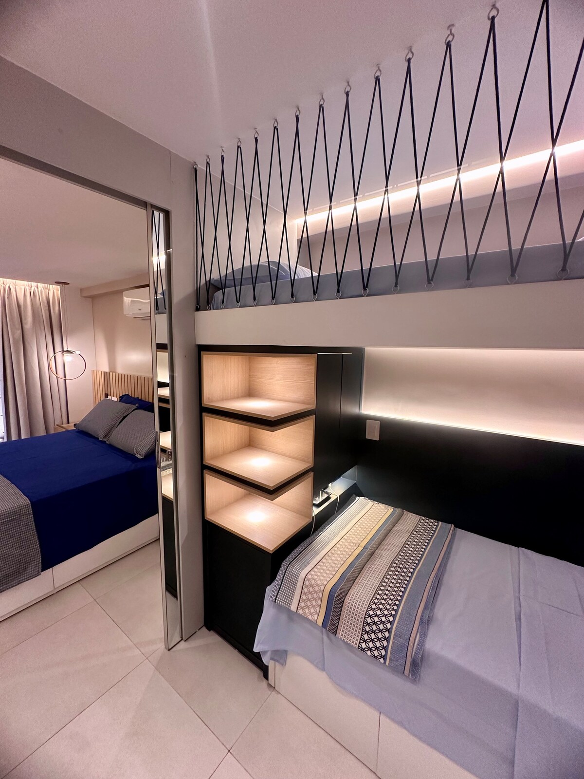 * Sofá cama na sala ( se houver o quinto hóspede, obrigatoriamente, deve ser uma criança de até 10 anos). * 1 quarto casal, ao fechar a porta do quarto (tranca), você isola o espaço da beliche que usará o ar condicionado da sala. * Enxoval completo * AIR fryer * Forno * Microondas * Geladeira * Cooktops * Secador de cabelo * Collers * Utensílios de cozinha * Pratos de melamina, taças e copos em acrílico para piscina/praia * 2 Tv’s * Ar condicionado 2 * Rico em armários * Lava & Seca e vara