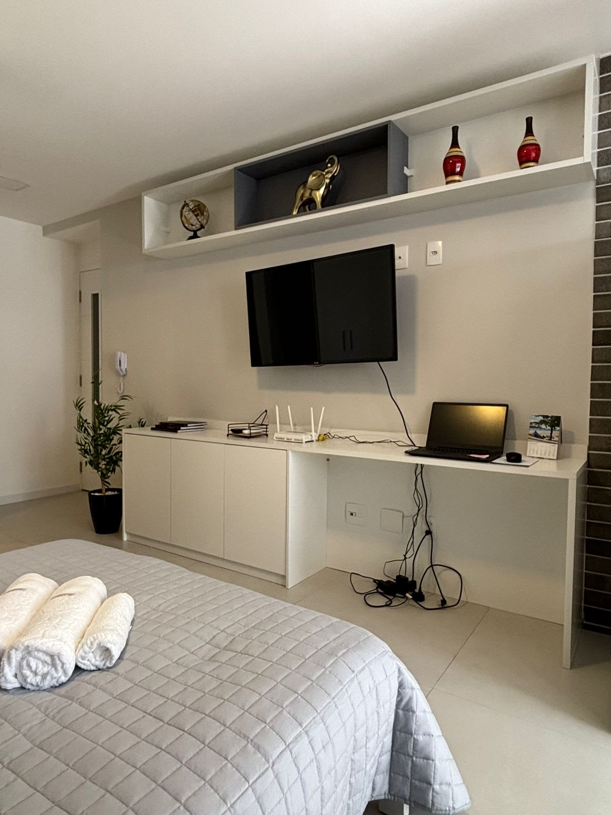 ¡Ideal para quienes buscan estilo con sofisticación y mucha comodidad! Cama king, enchufe, USB y lámpara de lectura en ambos lados TV 75" Smart Sofá cama muy cómodo Balcón Gourmet Ventiladores de techo Aire acondicionado 24000Btus Cocina completa Ducha doble de flujo de agua Armario de 3 puertas con espejo de cuerpo entero Filtro de agua potable (grifo de cocina) Cocina de inducción Lavandería en el edificio Internet de 500MB Ropa de cama y toallas (estándar de hotel) Recién montado - Inicio Oct/24