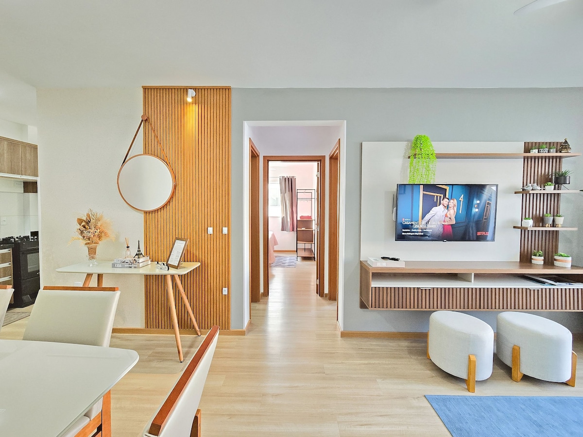 Apartamento nuevo, con piscina colectiva y ascensor, ubicación privilegiada, cerca de supermercados, restaurantes y tiendas. Con una suite doble, 1 dormitorio con 2 camas individuales y 2 colchones adicionales, ambos con aire acondicionado dividido, sala de estar, comedor TV inteligente y Wi-Fi, balcón con barbacoa, cocina con nevera dúplex, microondas, cafetera eléctrica, sandwichera, licuadora y otros utensilios, área de servicio con lavadora y estacionamiento para un coche.